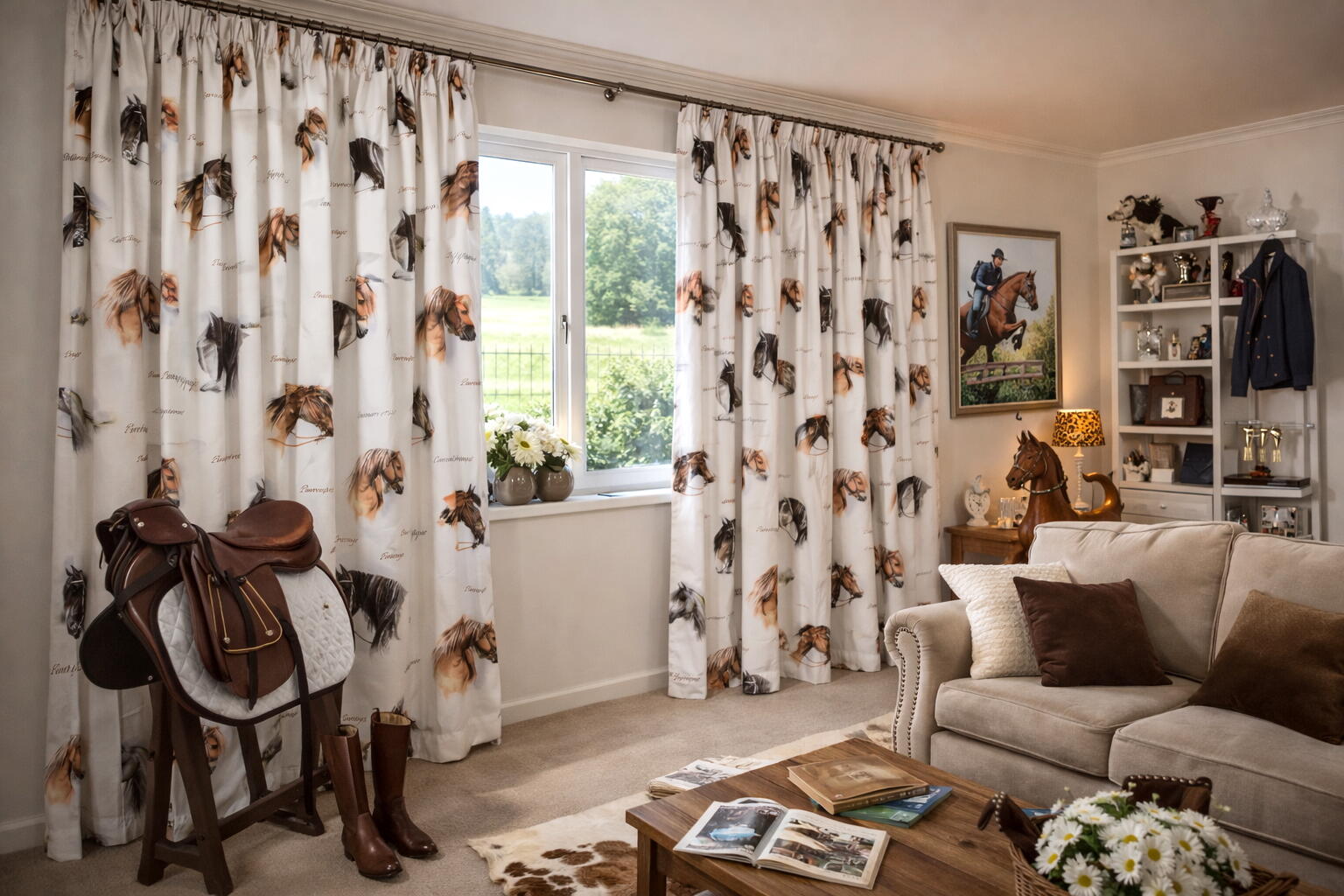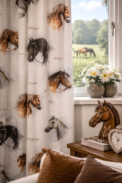 Breng de magie van de manege, de rust van de wei en de elegantie van dressuur naar je interieur met dit prachtige paardengordijn. De stof is rijk gedecoreerd met sierlijke paardenhoofden in verschillende rassen en houdingen, van trotse hengsten tot elegante dressuurpaarden. Subtiele teksten zoals Dressage, Concours Hippique en Parade geven het geheel een authentieke, hippische uitstraling. Dit gordijn is een echte eyecatcher voor iedereen met een passie voor paarden, paardrijden en het buitenleven.