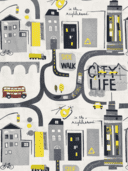 Het gordijn City Life brengt een complete stad in beeld, vol gebouwen, wegen en voertuigen. In het patroon zie je hoge woontorens, kleine huizen, hotels, bruggen en straten die zich in zachte bochten over de stof bewegen. Tussen de wegen rijden bussen, auto’s en vrachtwagens, terwijl een helikopter boven de daken vliegt. Ook kleine details zoals verkeerslichten, fietsen, bomen en bordjes met teksten als Side Walk en City Life geven het geheel een speels en herkenbaar karakter.