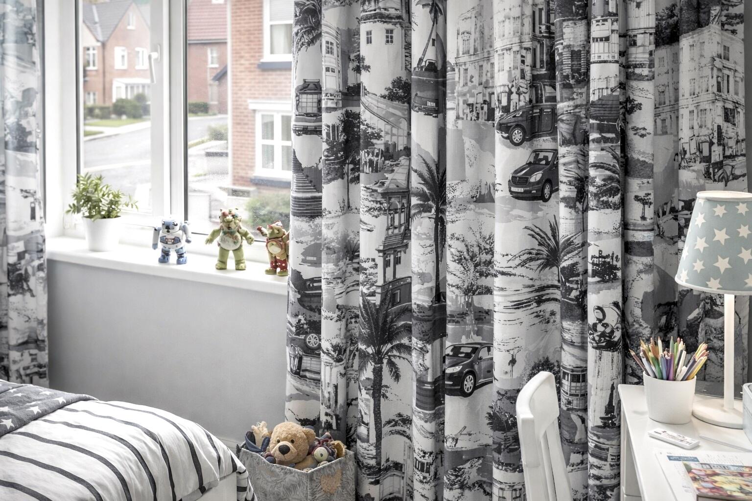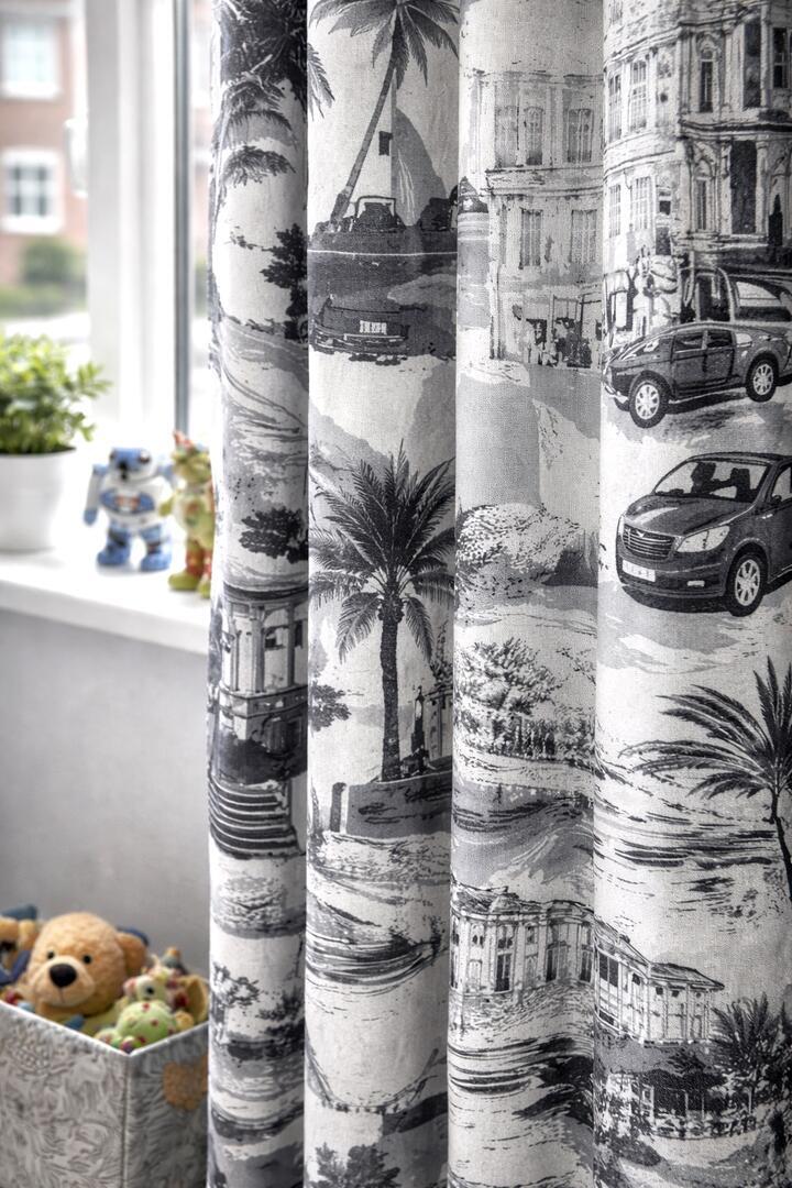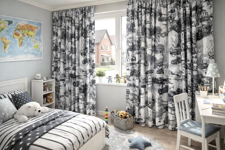 De afbeeldingen zijn als een doorlopende collage over het gordijn verdeeld. Grote gebouwen wisselen af met straatbeelden en kustlijnen, waardoor het patroon levendig blijft. Wanneer het gordijn in plooien langs het raam hangt, verschijnen steeds andere onderdelen van het motief. Zo blijft het gordijn interessant om naar te kijken en vormt het een opvallend onderdeel van de kinderkamer.