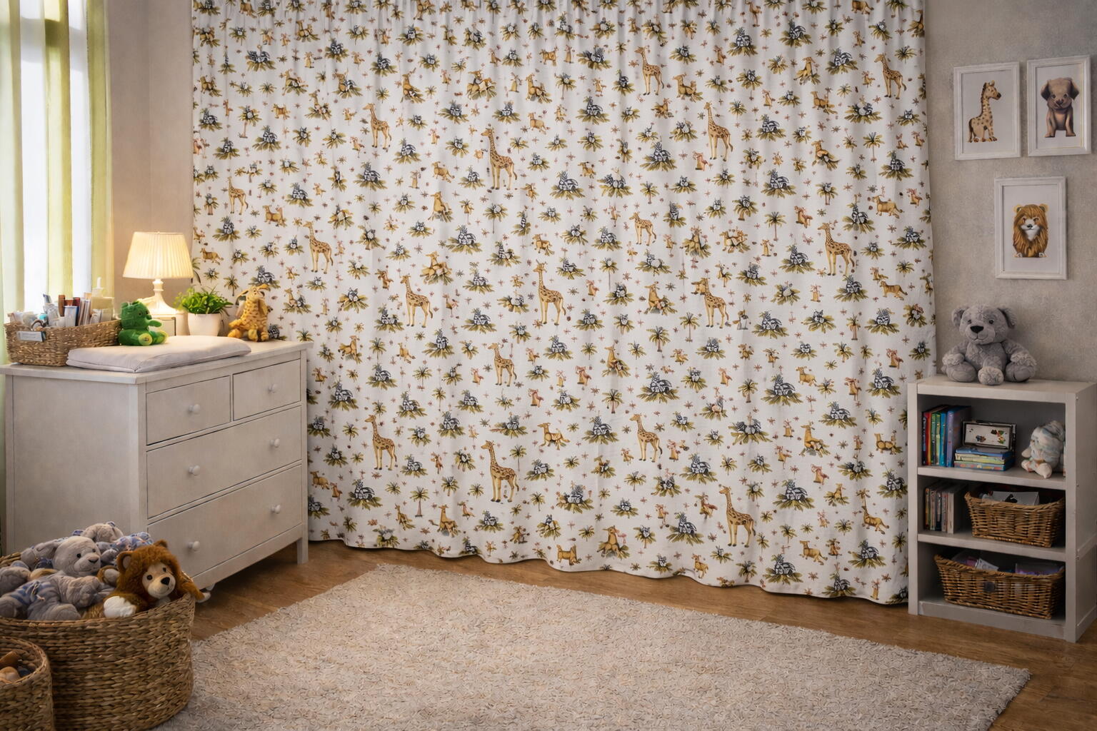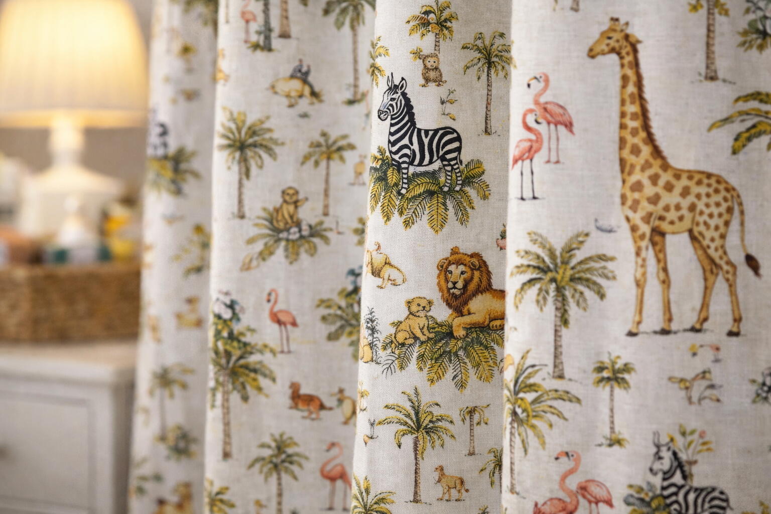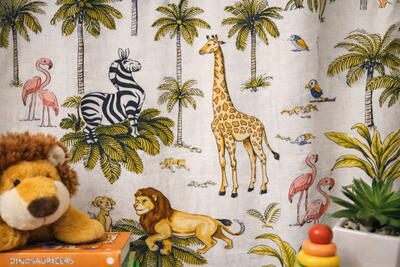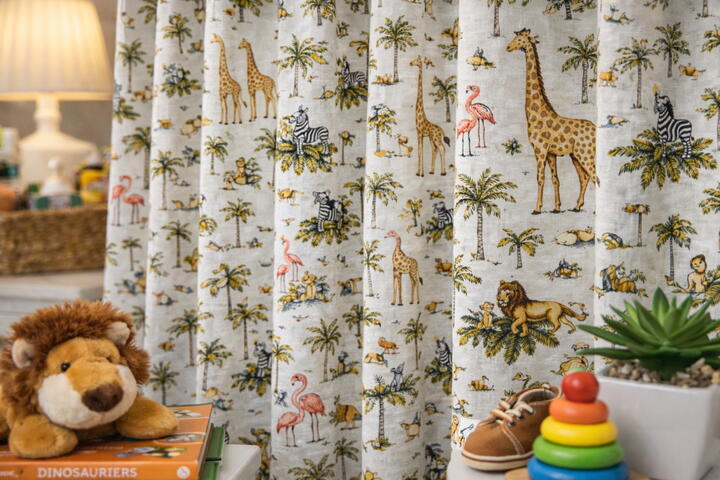 Het Simba gordijn is uitgevoerd in mooie rustige kleuren. Wilt u weten of deze kleuren aansluiten bij de rest van de kinderkamer? Dan kunt u een kleurstaaltje van de stof bij ons bestellen. U kunt dan ook meteen de kwaliteit van de stof beoordelen. De stof is van zichzelf niet verduisterend, wij kunnen de stof voorzien van extra isolatie om het gordijn verduisterend te maken. Bijkomende voordelen zijn dat de gordijnen ook warmte tegenhouden in de zomer, kou in de winter en ze werken geluidswerend. U kunt deze keus aangeven in het bestelmenu. Wilt u het thema van de Lion King nog verder laten terugkomen in de slaapkamer? Dan kunt u ook kussens laten maken van de stof. Dit sluit heel mooi aan bij de Lion King gordijnen.