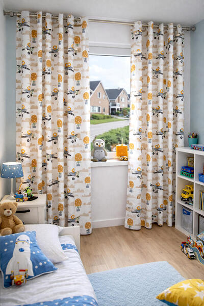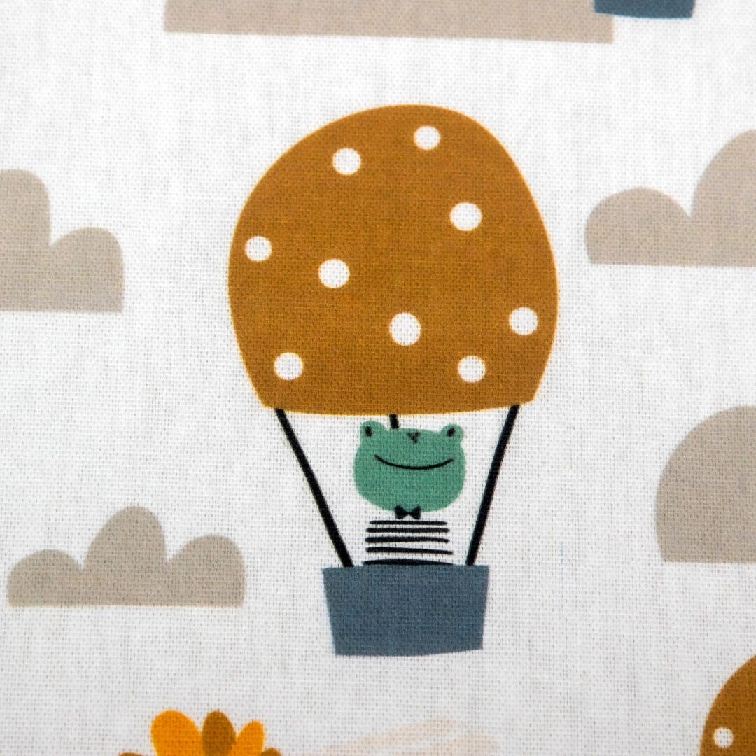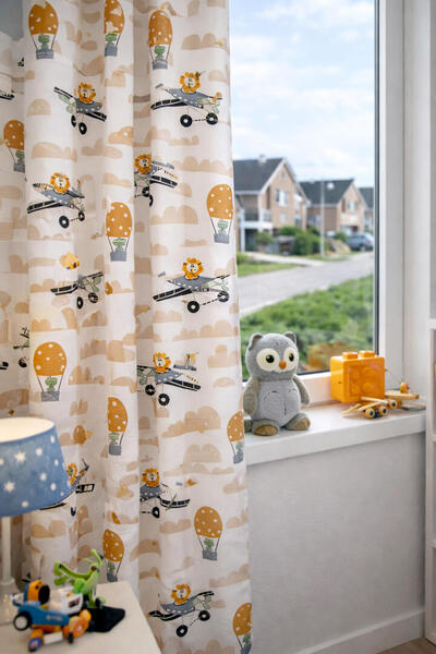 Het kindergordijn Skyballoon geeft de kinderkamer een vrolijke en speelse uitstraling. Het motief toont luchtballonnen die tussen zachte wolken zweven en retro vliegtuigjes met een vriendelijke piloot. In de mandjes van de ballonnen zitten kleine dierfiguurtjes, wat het patroon extra leuk maakt voor kinderen.