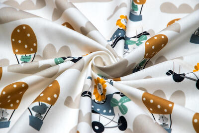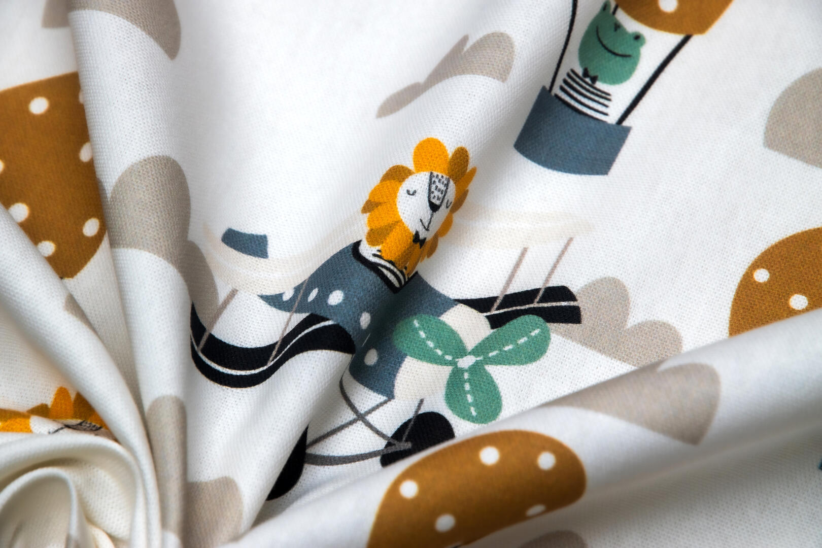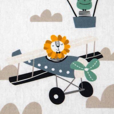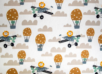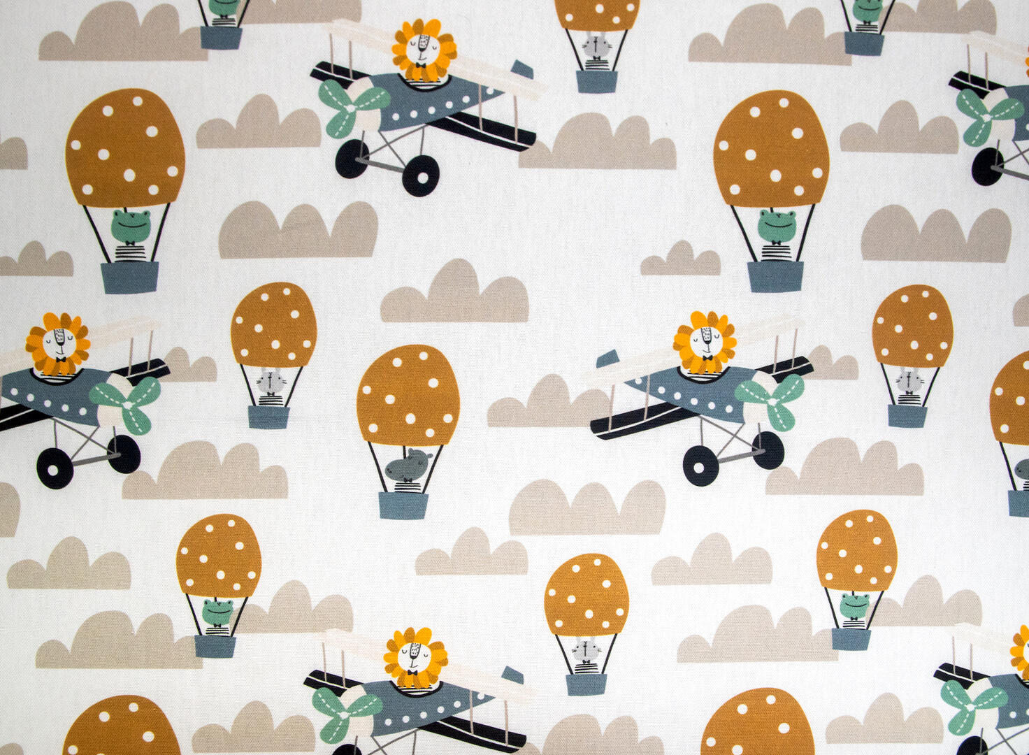 De stof heeft een rustige achtergrond met beige wolken, terwijl de luchtballonnen in warm okergeel met witte stippen zijn uitgevoerd. De vliegtuigjes hebben grijsblauwe en donkergrijze tinten met mintgroene accenten bij de propeller. De piloot heeft gele en oranje tinten, wat het geheel een vrolijke uitstraling geeft.