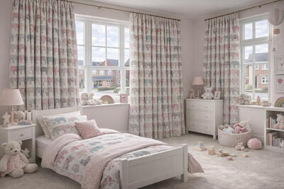 De ondergrond van de stof is naturel van kleur en heeft een zichtbare, fijne linnenstructuur. Dit geeft het gordijn een matte en stofachtige uitstraling, wat het dessin extra mooi tot zijn recht laat komen. De print is duidelijk aanwezig, maar niet schreeuwerig, waardoor het gordijn zowel geschikt is voor jonge kinderen als voor kamers waar het interieur mee mag groeien.