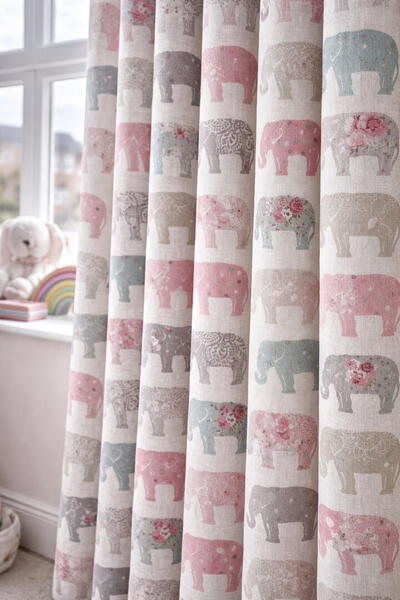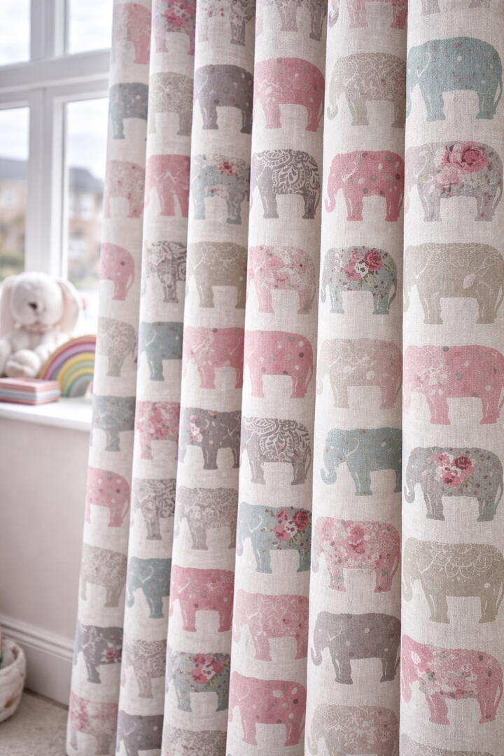 Het kindergordijn Sweet Gentle Giants is een speelse en tegelijk rustige keuze voor de kinderkamer. De stof is bedrukt met een herhalend patroon van olifanten, elk met een eigen karakter en decoratie. De olifanten zijn afgebeeld in een strak zijaanzicht en wisselen elkaar af in verschillende uitvoeringen: effen silhouetten, verfijnde bloemmotieven, stippen en sierlijke lijntekeningen. Dit zorgt voor een levendig geheel dat toch overzichtelijk en kalm oogt.