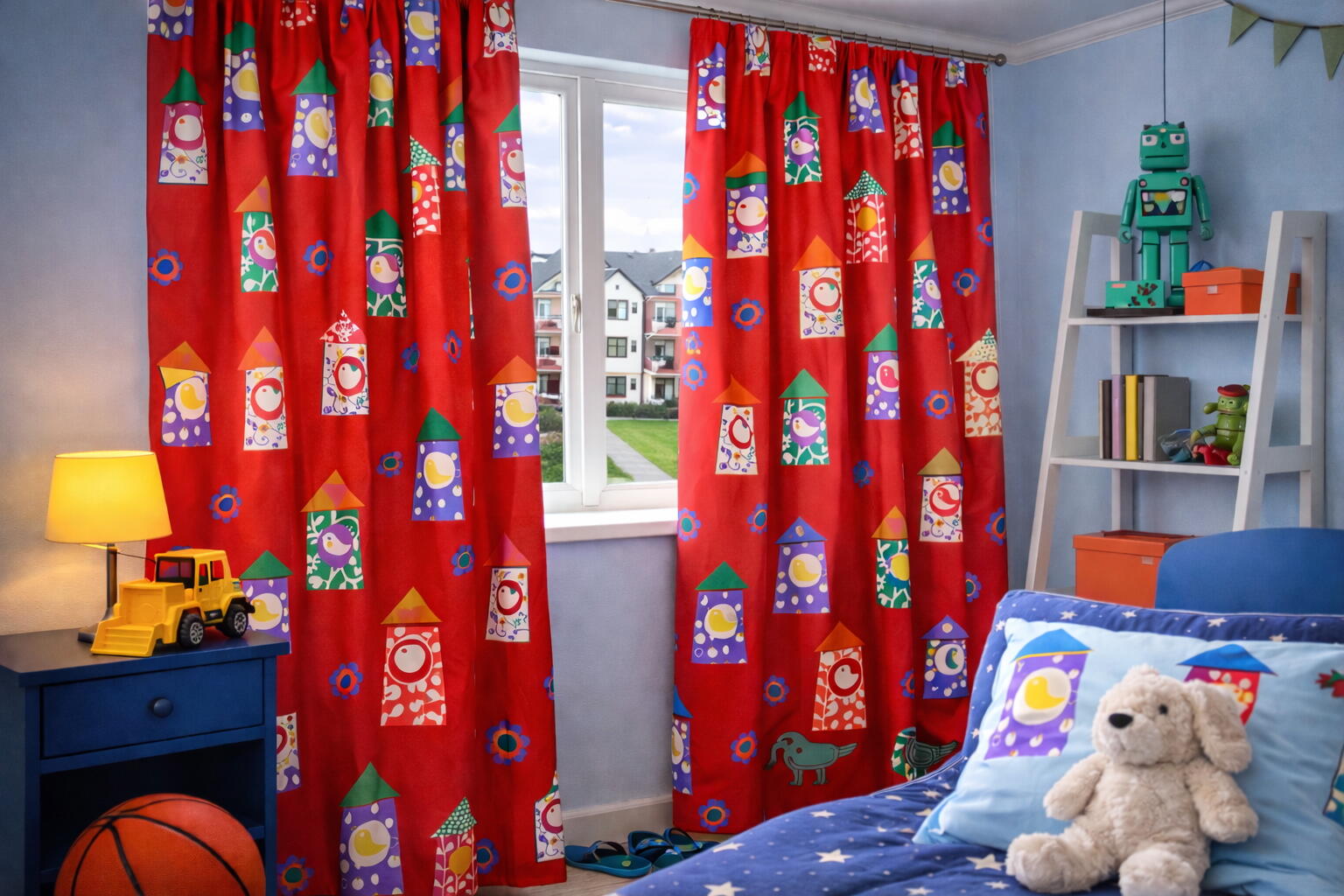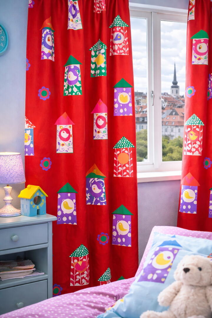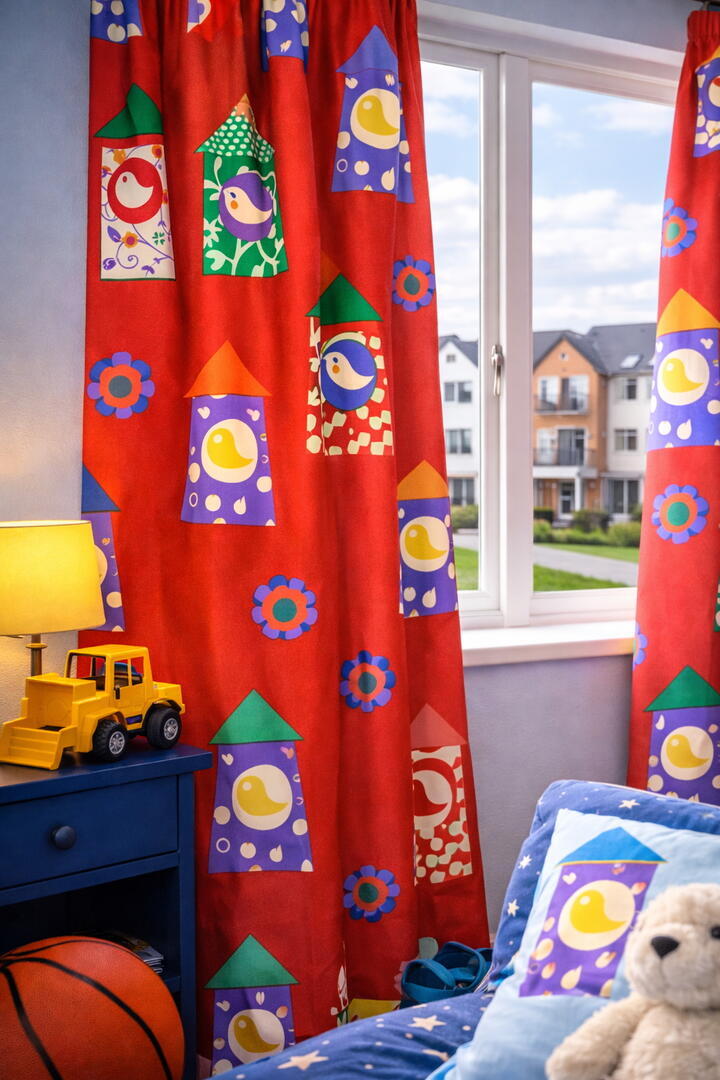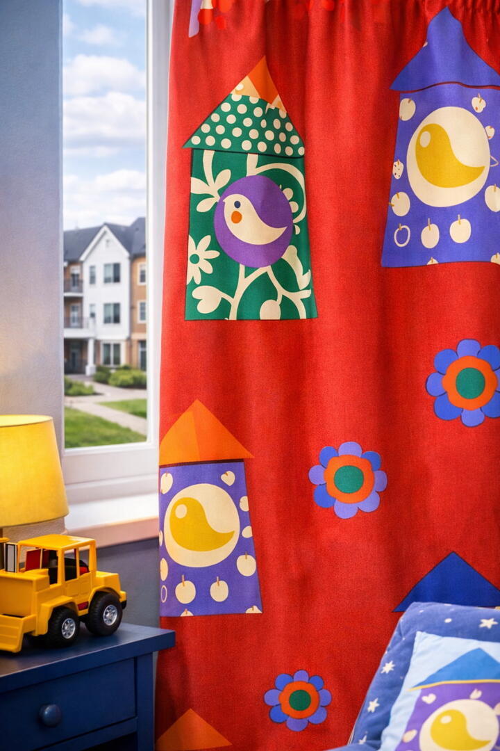 Dit unieke kindergordijn met speelse huisjes, vogeltjes en bloemen brengt leven in elke kinderkamer. De frisse kleuren en het grafische dessin maken dit gordijn perfect voor zowel jongens als meisjes – iets wat je ook terugziet in onze sfeerfoto’s, waarin we zowel een stoere jongenskamer als een gezellige meisjeskamer hebben ingericht met ditzelfde gordijn. Het resultaat? Een veelzijdige, warme uitstraling die zich moeiteloos aanpast aan iedere stijl en leeftijd.
