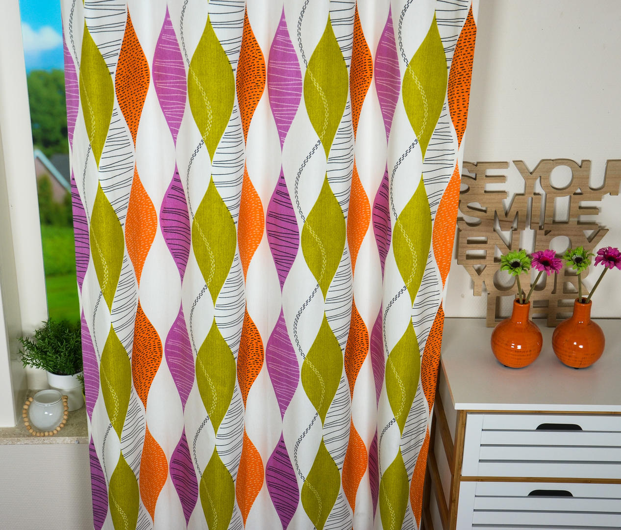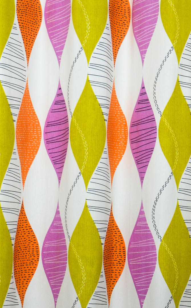 Scandinavisch georiënteerd gordijn, rustig en repeterend. Want waarom is deze woontrend nu zo succesvol? De inrichting wordt rustig gekozen, met kleuraccenten en zwarte highlights. Veel wit en hout worden gebruikt in combinatie met grafische en geometrische prints. De meubels zijn minimalistisch, liefst authentiek. Riet en rotan mag weer. In dat sfeertje past dit gordijn perfect! Deze geometrische blaadjes zijn 25 cm hoog en gedrukt op een warm witte, matte ondergrond. Kan jij deze Scandinavische stijl ook zo waarderen?