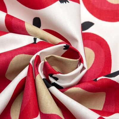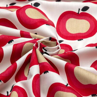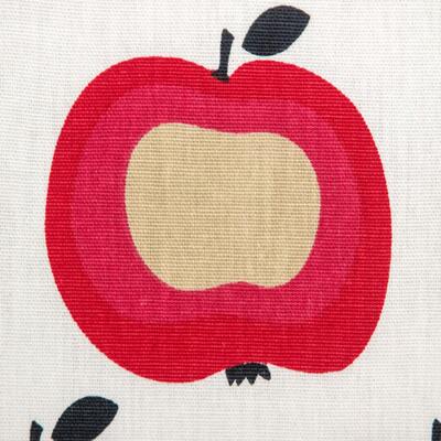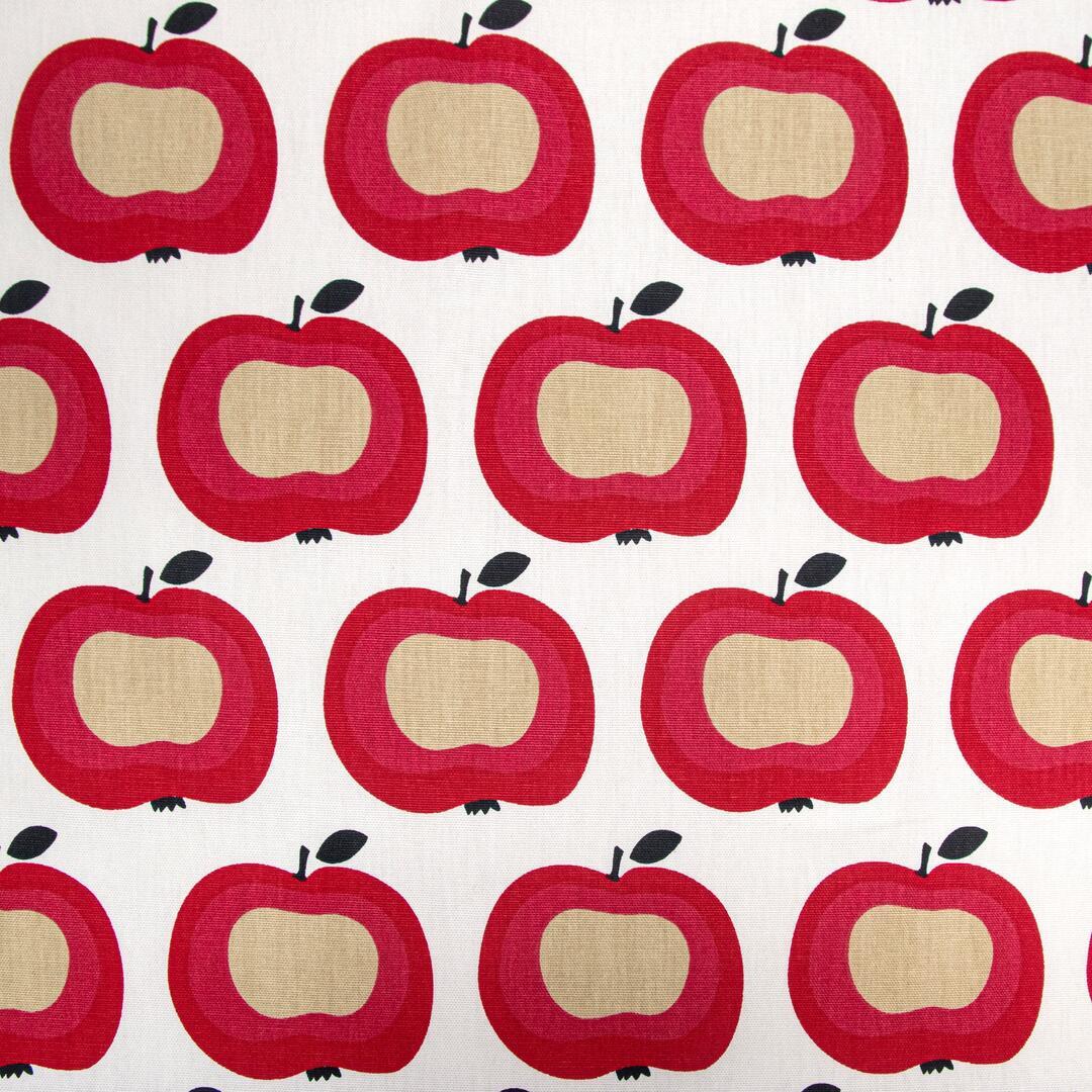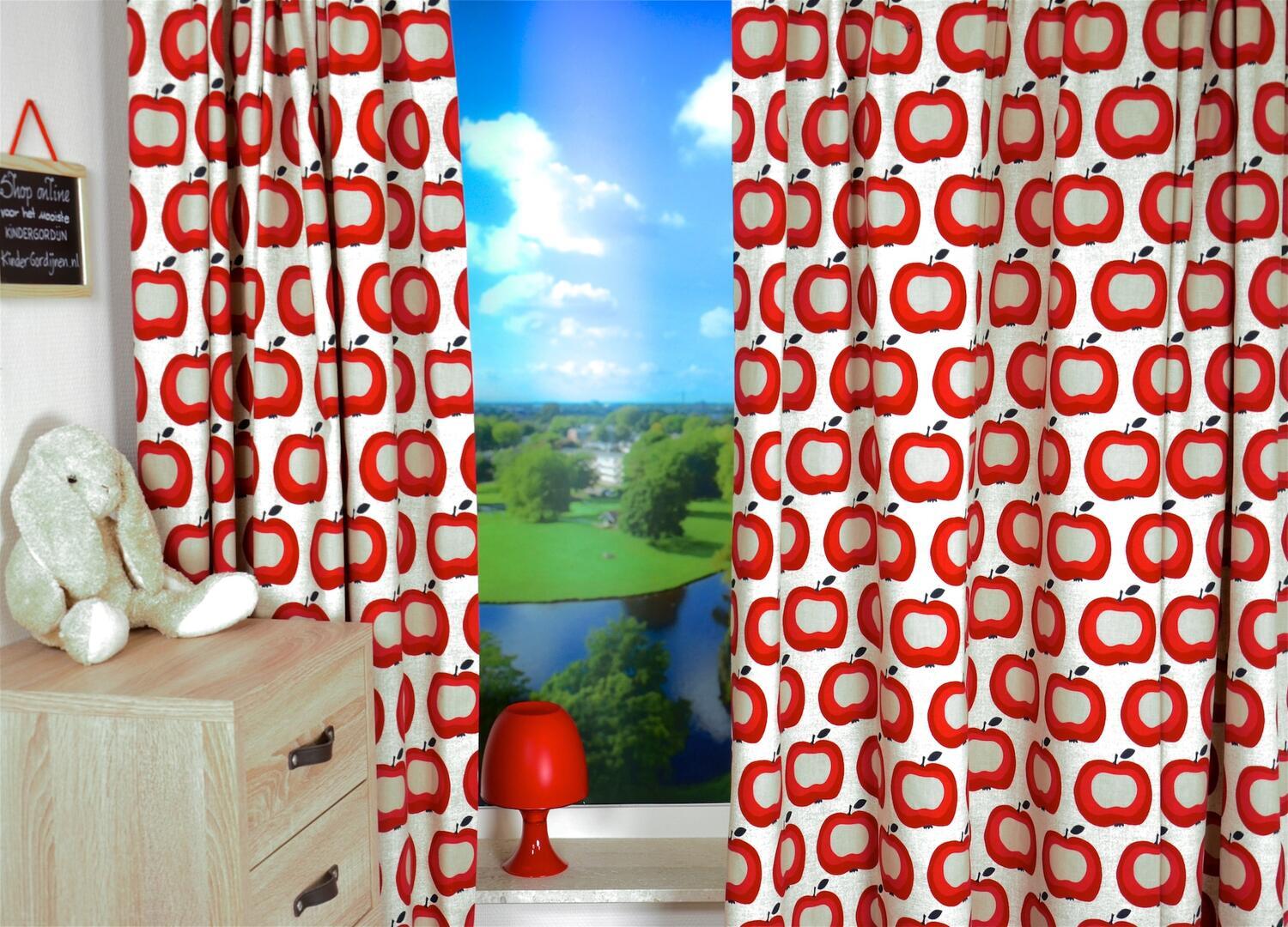 Een RETRO gordijn van appeltjesstof! De frisse rood-roze kleur ademt direct een warme en sfeer. De appelprint is gedrukt op witte gordijnstof, ze zijn 10 cm in doorsnede. Durf jij dit te combineren met riet & rotan en 70's oranje en olijfgroen? Ook warmwit op de wanden is een tijdloze optie. Voor verduistering even voeren.