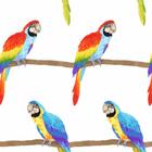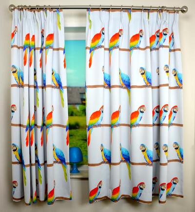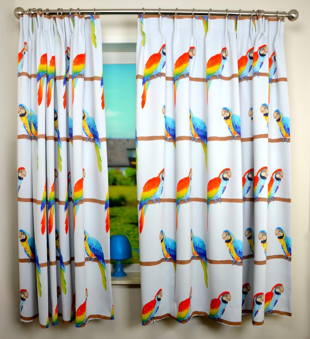 Creëer een zomerse sfeer in de kinderkamer met deze prachtige felgekleurde papegaaien op de gordijnen.