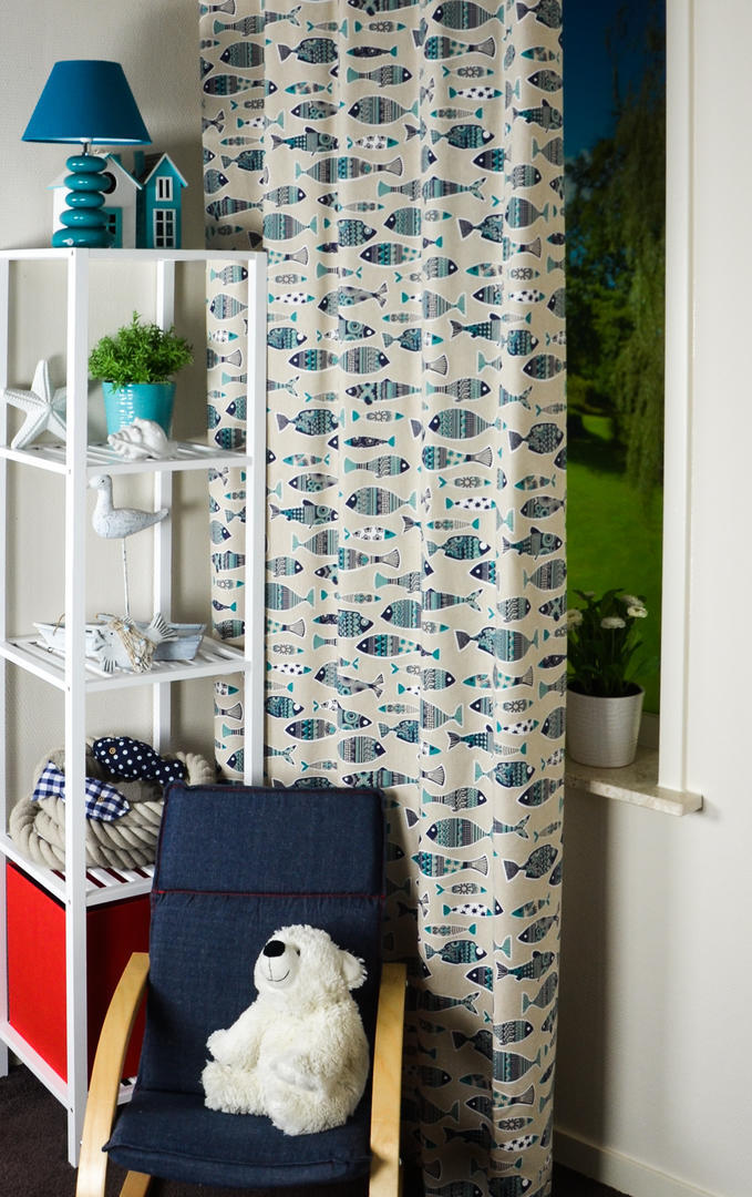 Deze gordijnstof met de naam Artful Fish is gemaakt van de beste materialen waardoor het gordijn mooi in de plooi valt.