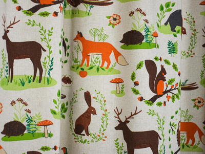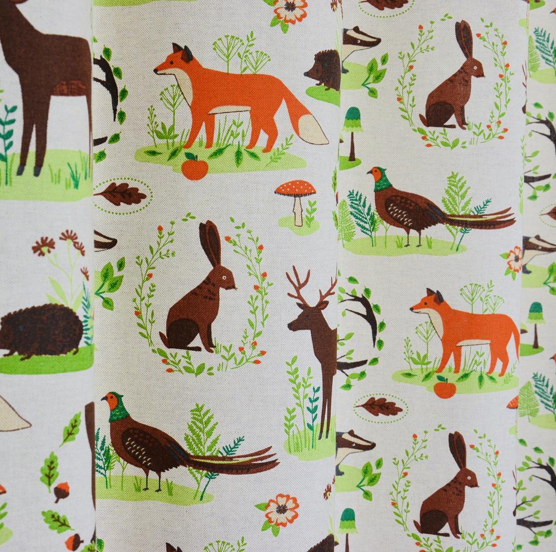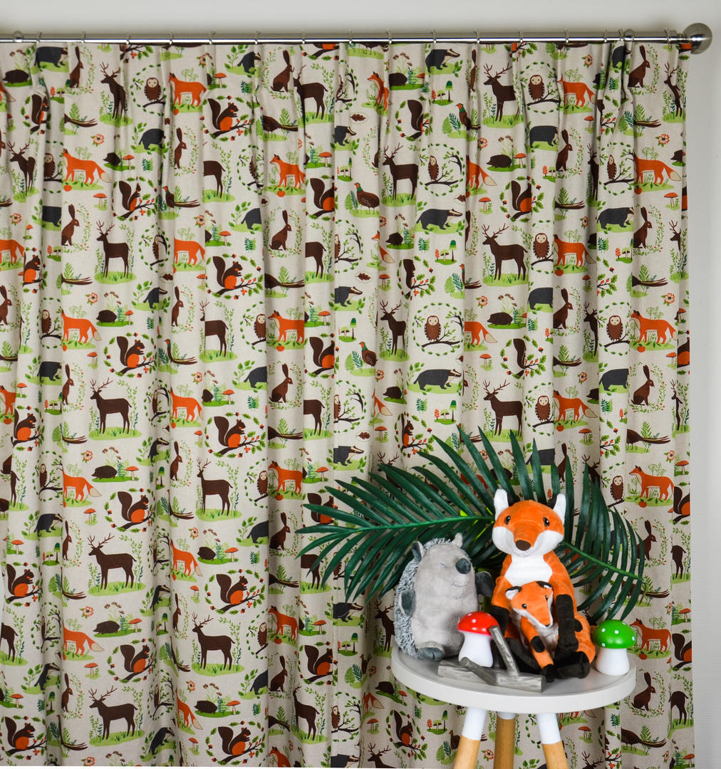 Prachtige linnen kindergordijnen met aandoenlijke illustraties van dieren in het bos. Deze stof is leuk te combineren met de Foxes, Triangle Fox en Forrest Life kindergordijnen. Voor het mooiste effect adviseren wij u om deze stof te laten voeren.
