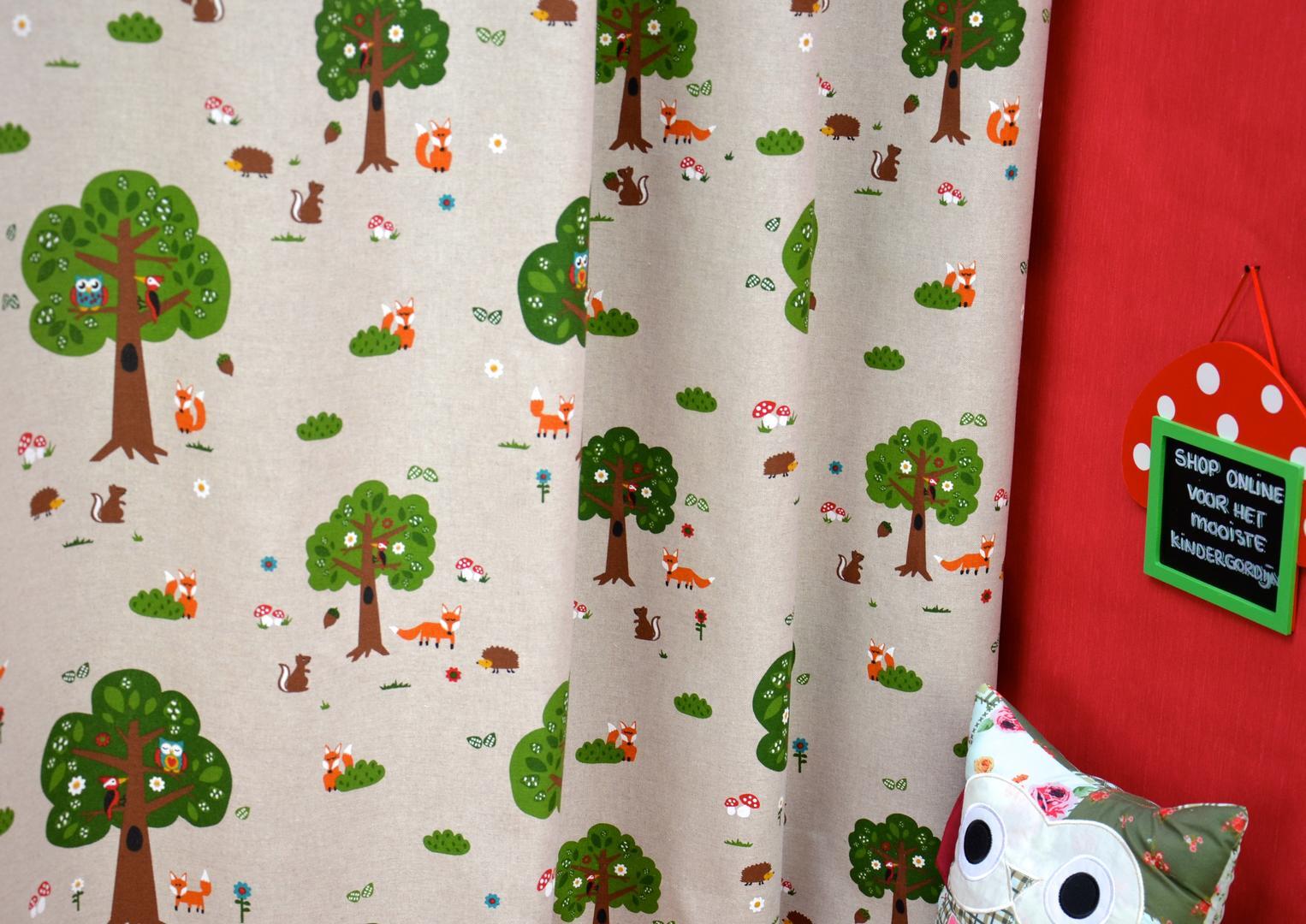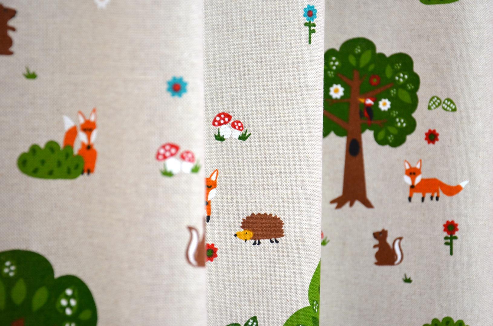 Prachtige linnen kindergordijnen met aandoenlijke illustraties van dieren in het bos. Deze stof is leuk te combineren met de Foxes, Triangle Fox en Forrest Life kindergordijnen. Voor het mooiste effect adviseren wij u om deze stof te laten voeren.