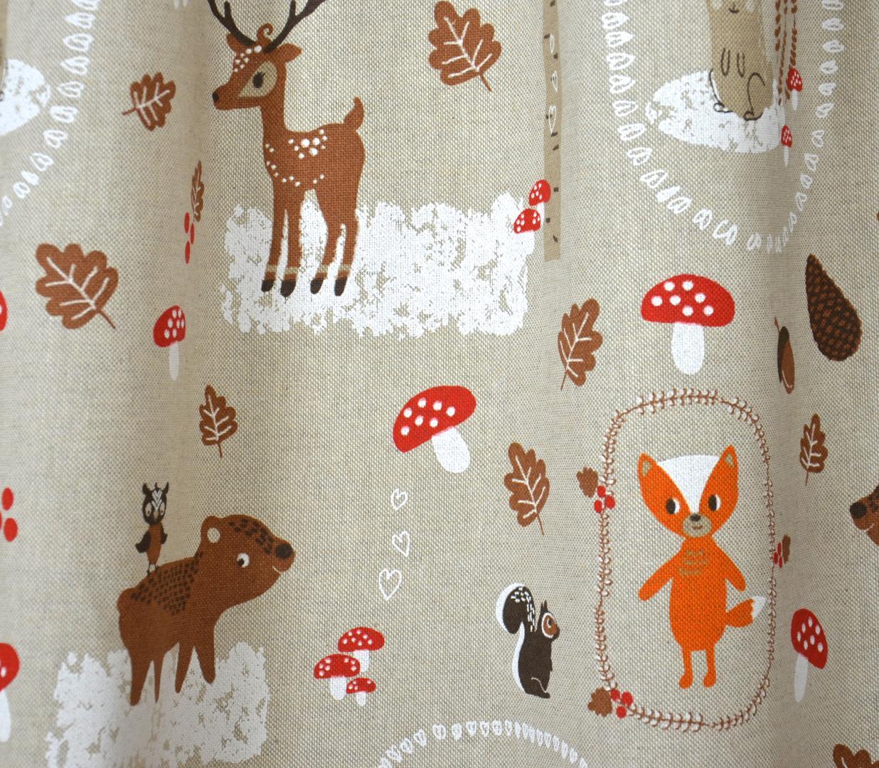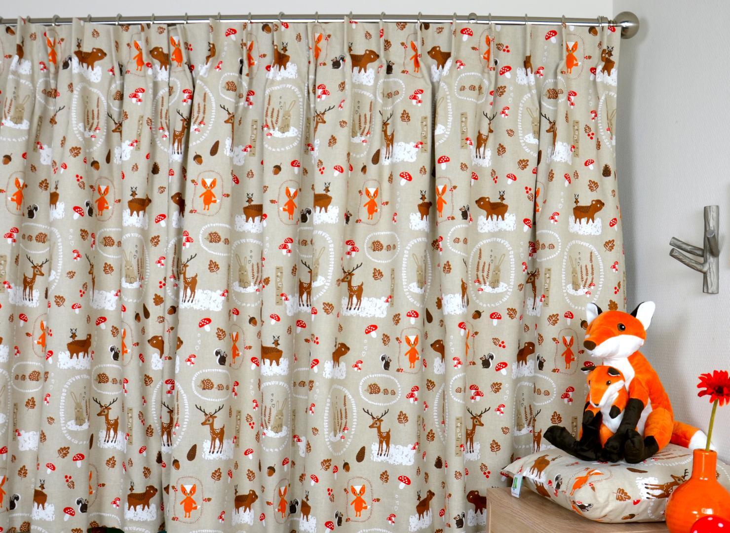 Héérlijk nostalgisch gordijn met allemaal vrolijke bosbeestjes. De afbeeldingen variëren van 2 tot 8 cm en zijn gedrukt op een fraai ‘antiek kleurige’ camel ondergrond. Het doek is mat en ietwat grover geweven. Daardoor lijkt het gordijn zó uit grootmoeders tijd te komen. Eekhoorn, egel en hertje Bambie willen heel graag bij jou komen wonen! Heb jij een fijn nestje op je slaapkamer? Voor verduistering evt. voeren.