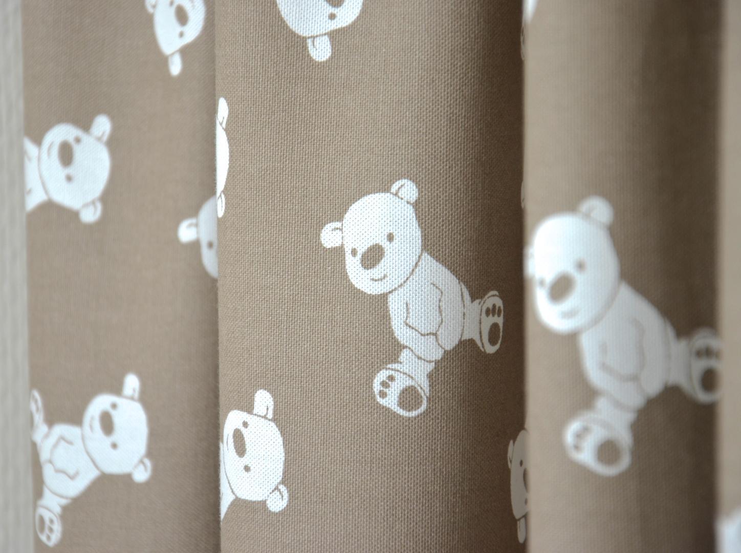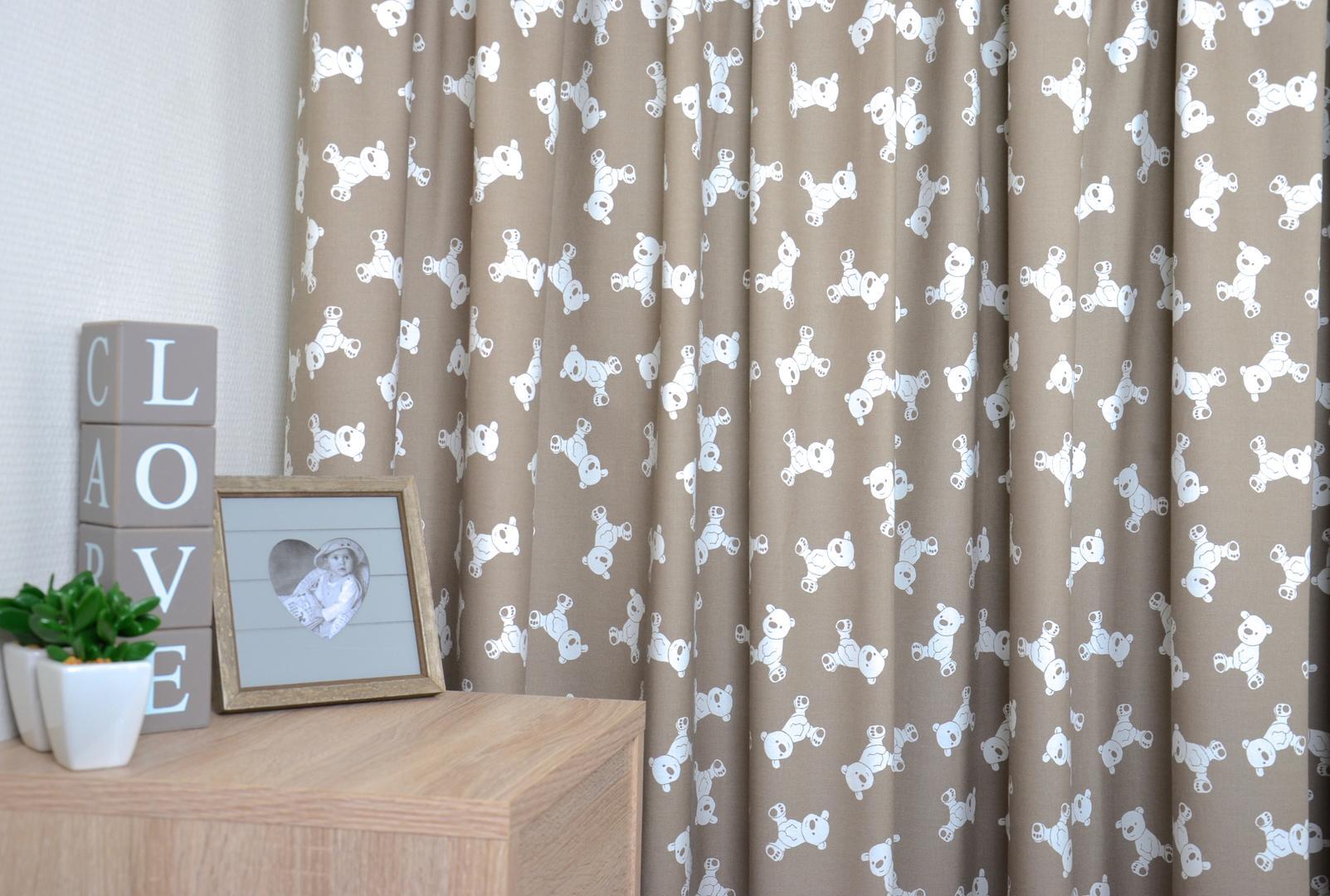 Vrolijk kijk ik de wereld in! Ja ook jij kleine beer! Dit gordijn is schattig voor de kleine van jou, door de kleine, tuimelende troetelbeer. Het 6 cm grote teddy beertje kijkt helder en eigenwijs de slaapkamer in. Door de herhaling van vorm, blijft het gordijn rustig en toch speels. De stof is leverbaar in 3 verschillende kleuren en kamerhoog, waardoor het gordijn zonder naden stijlvol tot de grond gemaakt kan worden. Voor verduistering desgewenst voeren.