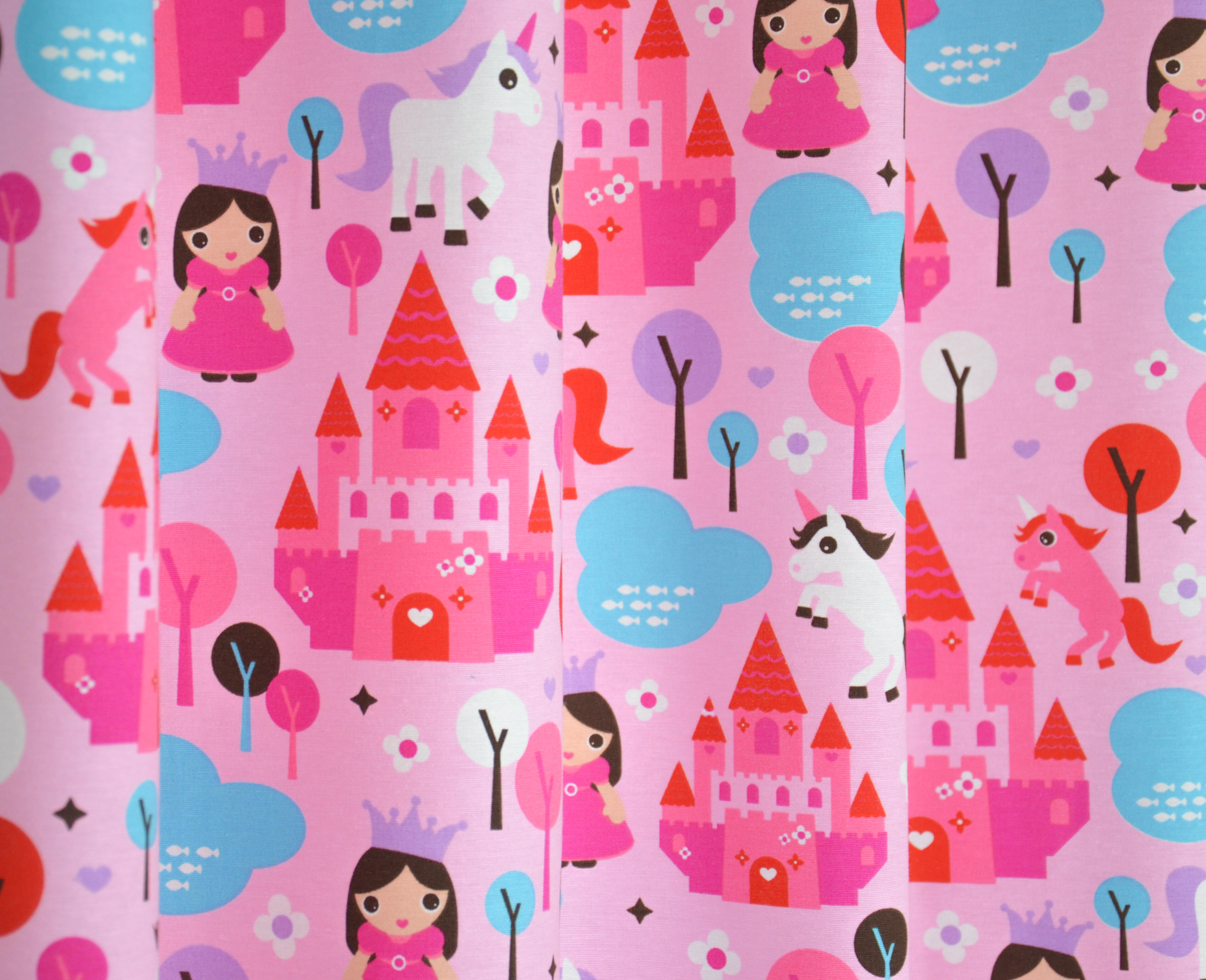 Kastelen, prinsessen en een eenhoorn, een gordijn uit een SPROOKJE! Een sprookje vol magie voor de meisjesslaapkamer. De eenhoorn is een mythisch dier en staat symbool voor zuiverheid. Hier is zij 7 cm groot en het kasteel 18 cm. Gedrukt op matte, ietwat geruwde stof. Het ‘prinsessen thema’ kan je natuurlijk leuk uitbouwen met accessoires; spiegeltjes, juwelenkistje, fluweel & linten. Voor jou als prinsesje in je DROOMkamer! Voor verduistering even voeren.