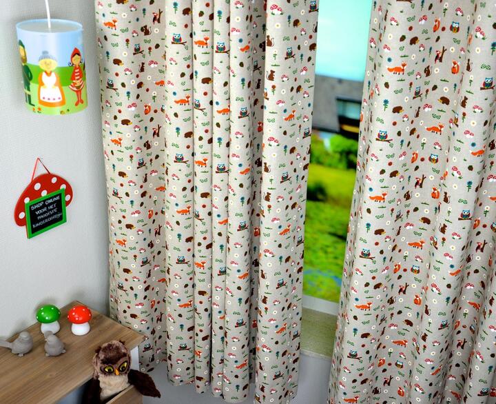 Het kindergordijn Forest Life is een vrolijk en retro gordijn, verkrijgbaar in 3 verschillende kleuren: roomwit, kastanjekleurig en canvas. kastanjekleurig. De nostalgische figuurtjes zijn gedrukt op een mooie, matte kwaliteit stof en hebben een afmeting van ongeveer 3 cm. Dit gordijn brengt de sfeer van vroeger terug in de kinderkamer, denk aan gezelligheid en knusheid zoals in grootmoeders tijd.