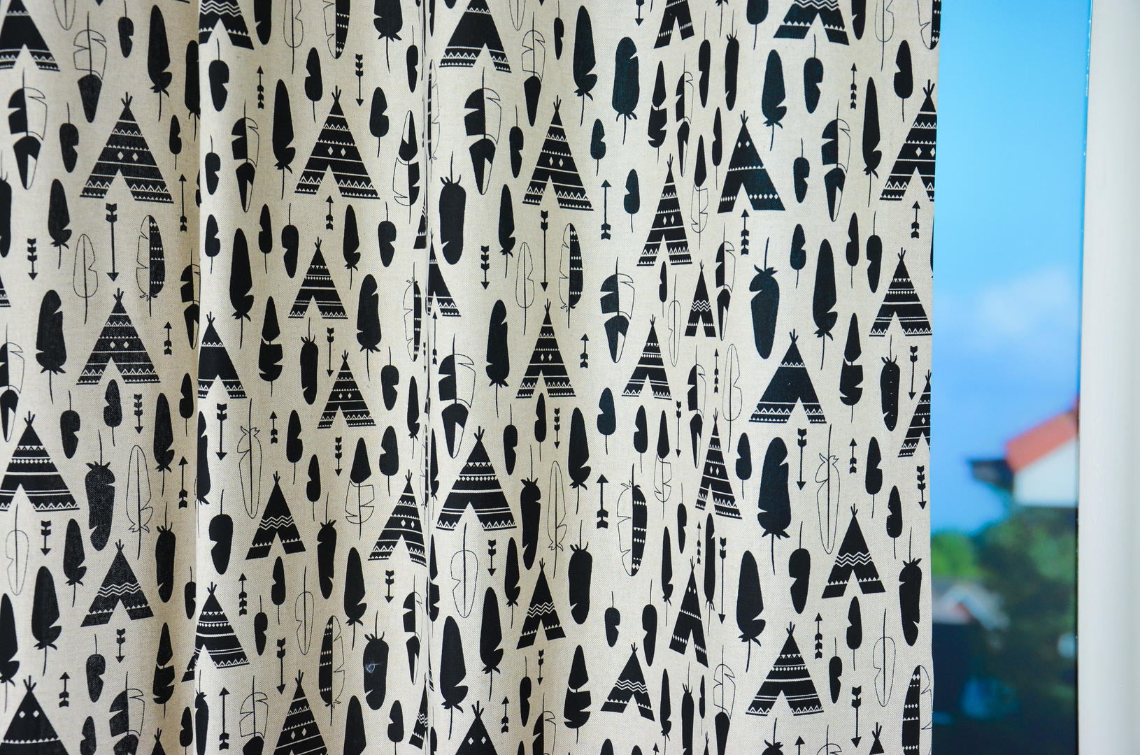 Schattige gordijnen voor de kinderkamer met tipi print. 100% katoen. Voor verduistering even voering toevoegen in het bestelproces.