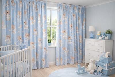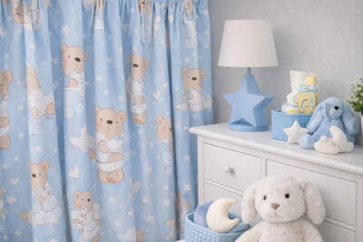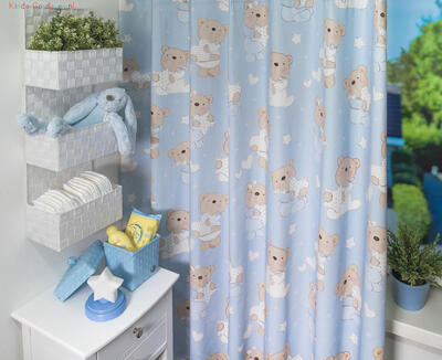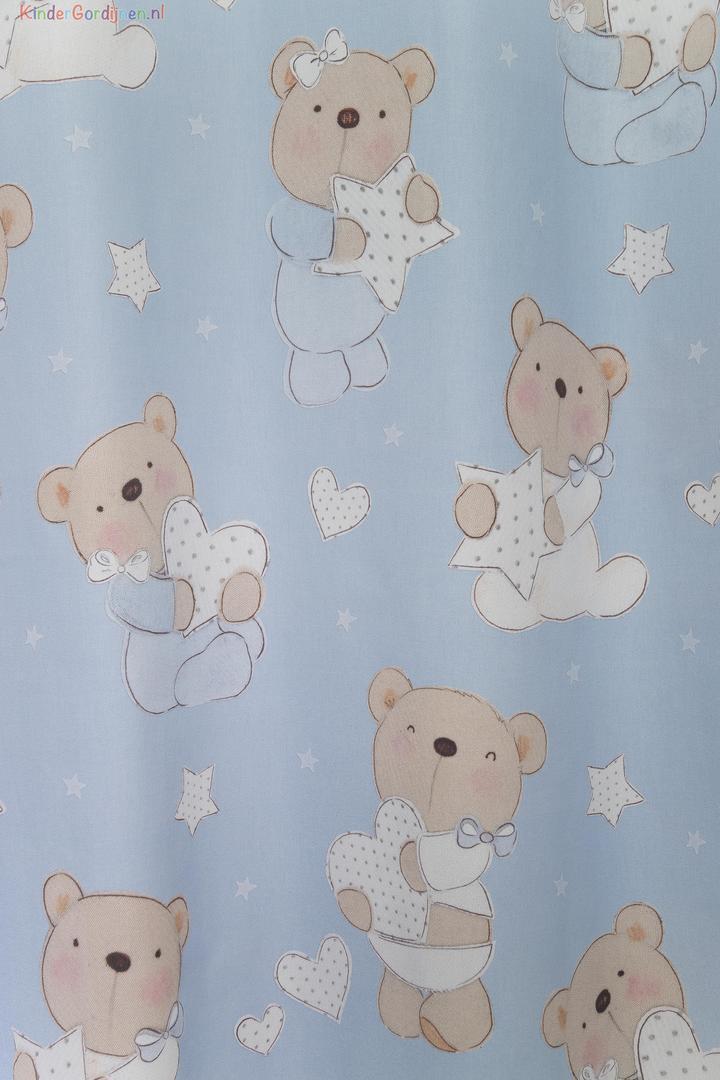 Babybear Blauw De vergrijsd blauwe uitvoering heeft een rustige, eigentijdse uitstraling. De lichtblauwe ondergrond is zacht en niet fel, waardoor het gordijn goed combineert met zowel witte als houten meubels. De teddybeertjes zijn uitgevoerd in warme zand- en crème tinten, wat zorgt voor een mooi contrast. Deze kleur is zeer geschikt voor een jongenskamer of een neutrale babykamer.