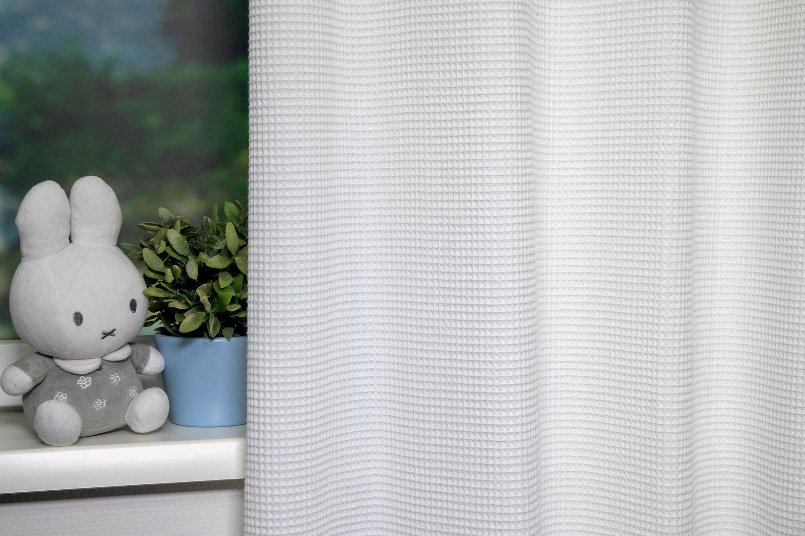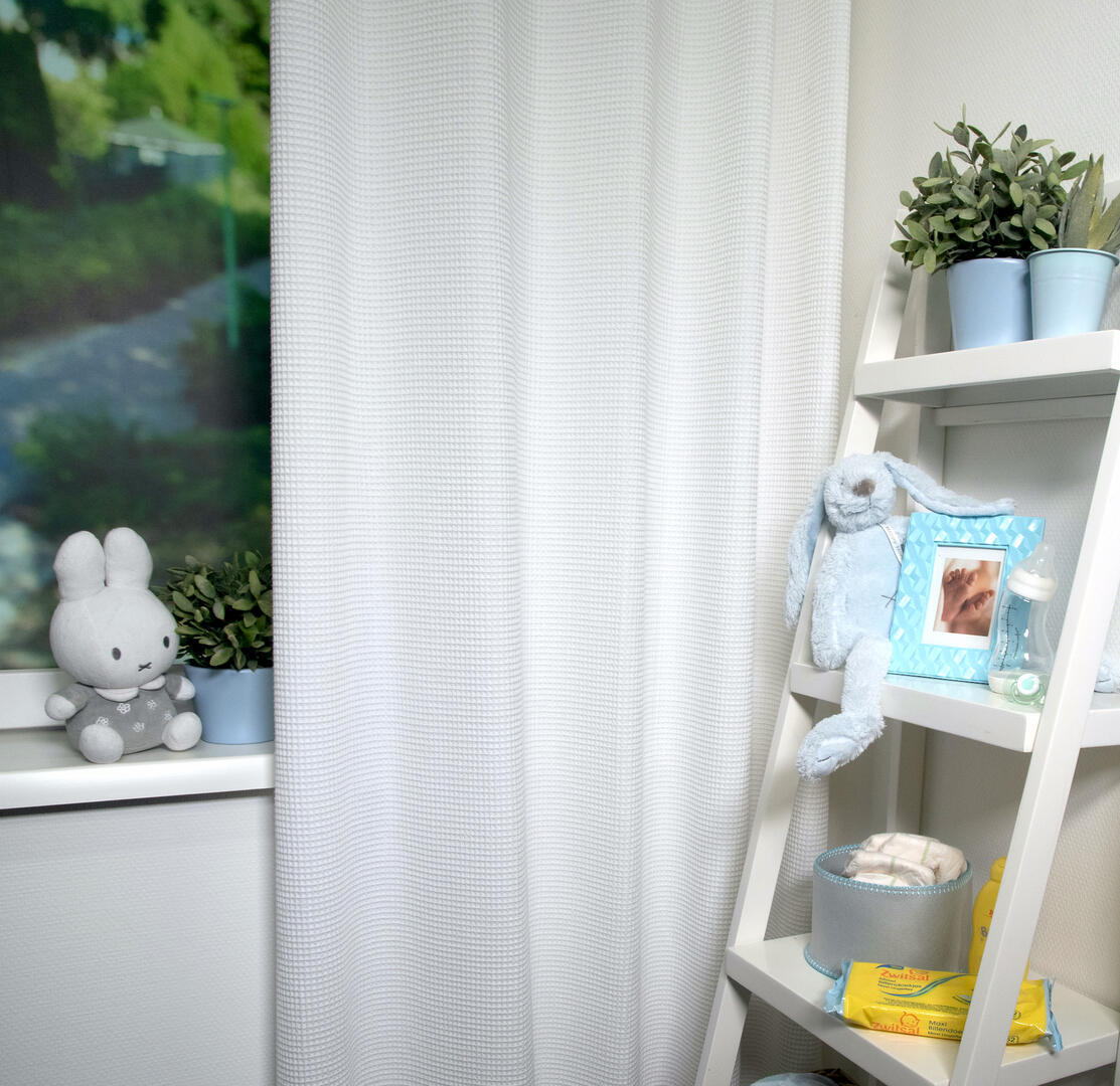 Gordijnstof met wafelpique structuur. Deze zachte gordijnstof is prima te combineren met benodigdheden in de babykamer zoals hydrofieldoekjes, washandjes, aankleedkussen etc. Voor extra functionaliteit zoals isolatie en verduistering, kun je tijdens het bestelproces kiezen voor de optie "Voering". De voering zorgt ervoor dat je babykamer in de wintermaanden lekker warm blijft en in de zomer juist koel. Bovendien dempt de voering geluid en beschermt het gordijn tegen verkleuring door zonlicht.