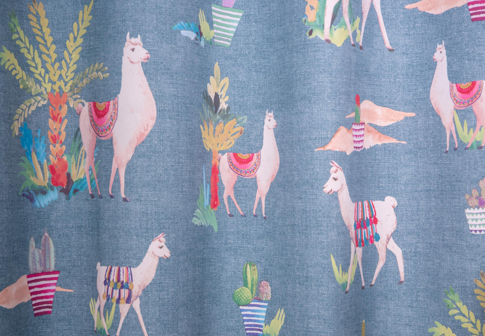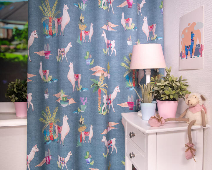 Het kindergordijn Lama is een speelse en opvallende keuze voor de kinderkamer. Op de stof zijn schattige lama's afgebeeld, die kleurrijk versierd zijn met kleden die doen denken aan de prachtige weefkunsten uit het verre oosten. Het kindergordijn Lama is verkrijgbaar in drie kleurstellingen: roze, blauw en lichtgroen. Deze kleuren zijn vrolijk en passen goed bij een kinderkamer. Je kunt de gordijnstof perfect afstemmen op de rest van de inrichting en een speelse en levendige sfeer creëren.