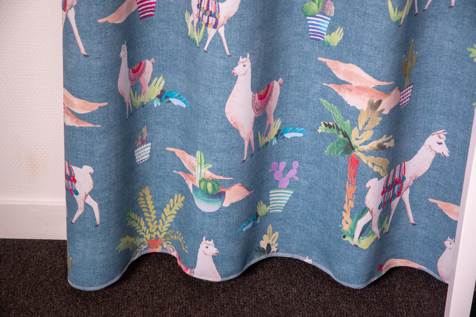 Naast de leuke print heeft het kindergordijn Lama ook praktische eigenschappen. De stof is namelijk semi-verduisterend, waardoor het een goede optie is om de kamer van je kind gedeeltelijk te verduisteren. Zwarte draden zijn verwerkt tussen de voor- en achterkant van de stof, wat zorgt voor extra verduistering. Op deze manier kan je kind genieten van een rustige en comfortabele slaapomgeving, zelfs als het buiten nog licht is. Als je benieuwd bent naar hoe de stof er in het echt uitziet, bieden we de mogelijkheid om een knipstaal te bestellen. Op die manier kun je de stof voelen, de kleuren bekijken en ervaren hoe het past in de kinderkamer. Zo kun je een weloverwogen beslissing nemen en het perfecte kindergordijn kiezen.