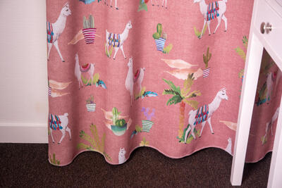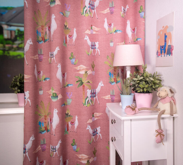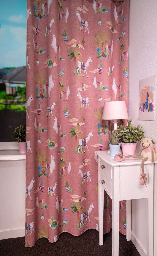 Het kindergordijn Lama is een speelse en opvallende keuze voor de kinderkamer. Op de stof zijn schattige lama's afgebeeld, die kleurrijk versierd zijn met kleden die doen denken aan de prachtige weefkunsten uit het verre oosten. Het kindergordijn Lama is verkrijgbaar in drie kleurstellingen: roze, blauw en lichtgroen. Deze kleuren zijn vrolijk en passen goed bij een kinderkamer. Je kunt de gordijnstof perfect afstemmen op de rest van de inrichting en een speelse en levendige sfeer creëren.