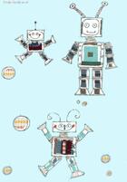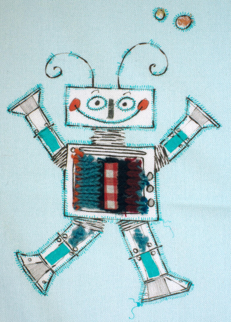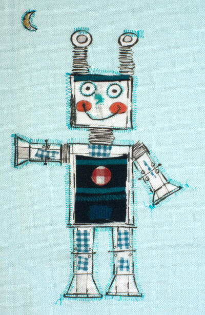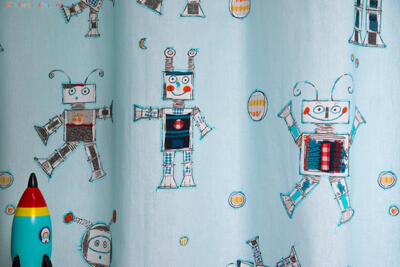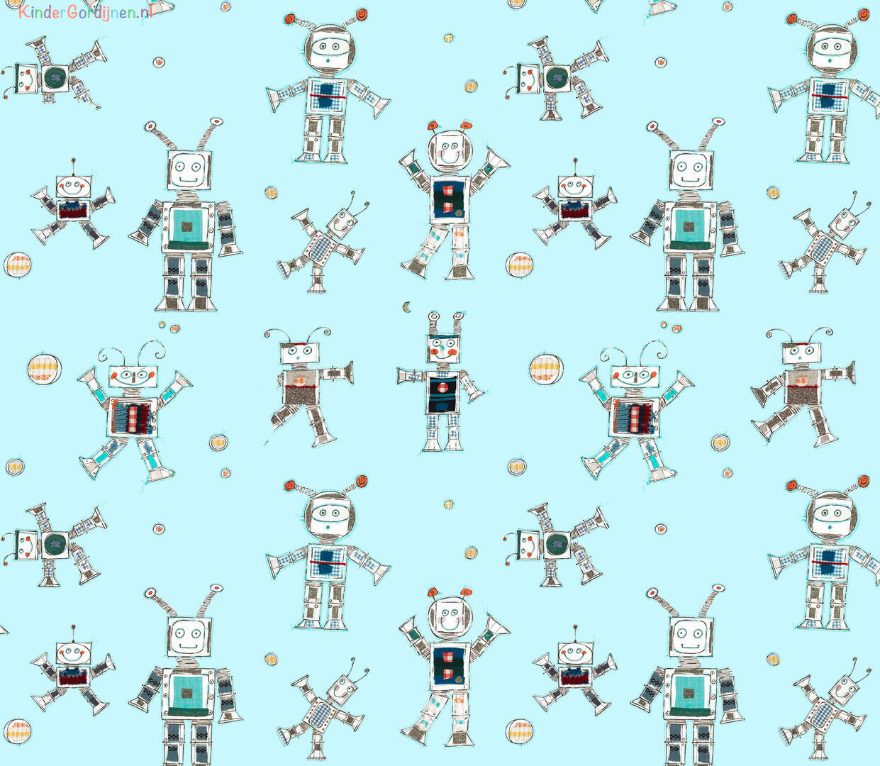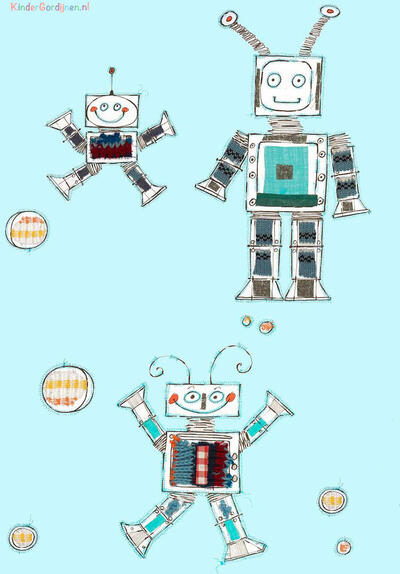 Bliep bliep! Vriendelijke handgetekende robots dansen over dit gordijn. Het ontwerp van dit gordijn is gemaakt door Hanneke de Jager. Voor verduistering even laten voeren.
