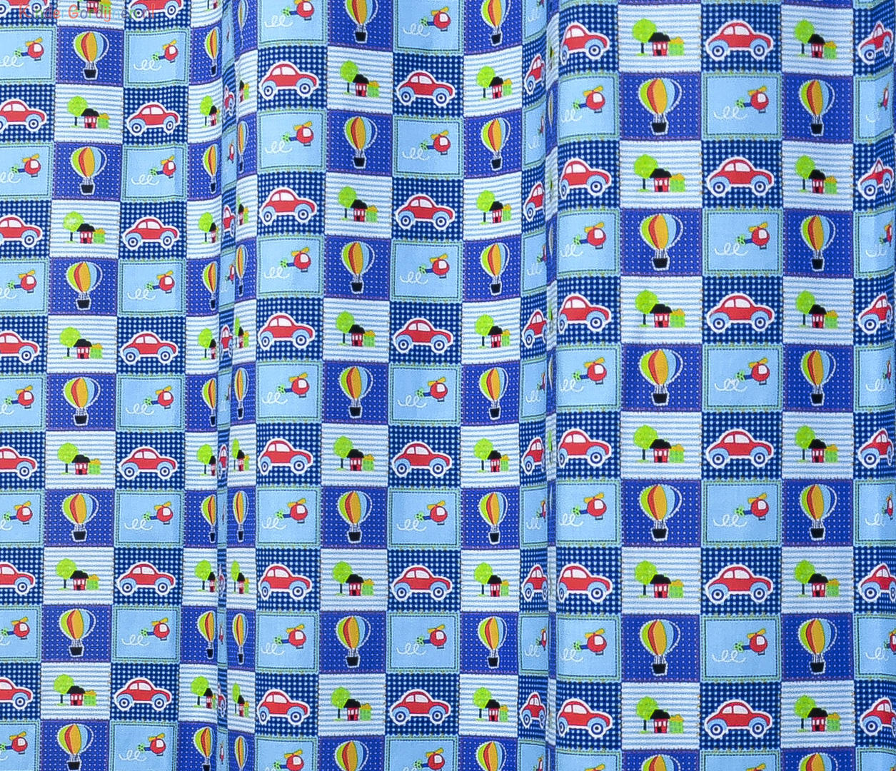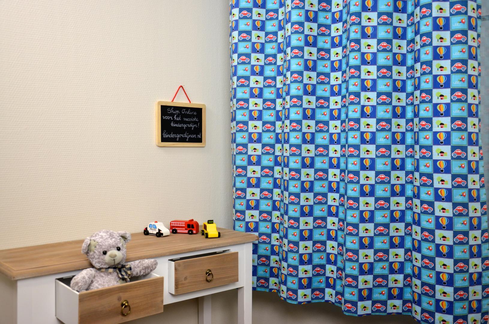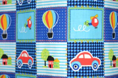 Vrolijk patchwork gordijn voor uw jonge zoontje versierd met auto's, luchtballonen en helikopters. Deze gordijnen maken elke kinderkamer tot een gezellige plek om uren te spelen of lekker weg te doezelen.
