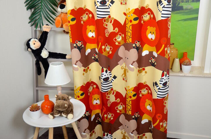 TE GEK, deze nostalgische beestenboel! Héérlijk wegdromen bij deze Afrikaanse dieren. Het patroon is royaal, waardoor het gordijn uitstekend voor grotere raam oppervlaktes geschikt is. De olifant is zo’n 20 cm groot, de giraffe met haar ranke hals natuurlijk wat langer. De dieren zijn gedrukt op matte katoen en desgewenst even verduisterend voeren.