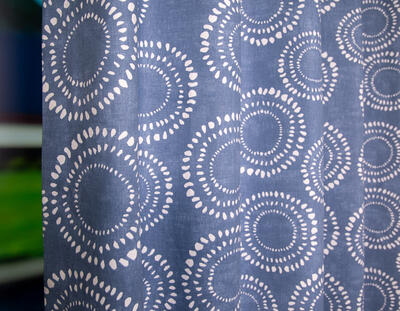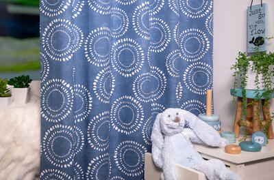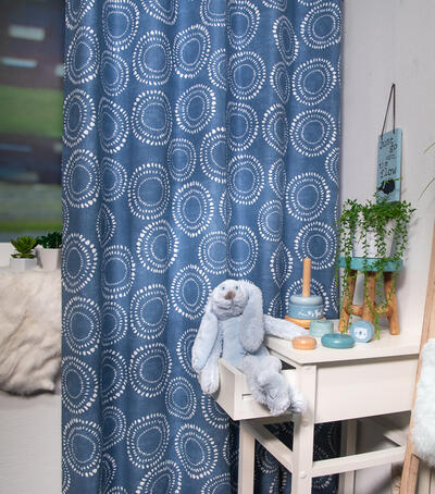 Breng een een stoer gordijn in de baby of kinderkamer met dit buitengewone Circling Dots gordijn. Dit prachtige gordijn is gemaakt van 100% katoen in een trendy denim kleur en is voorzien met een patroon van witte stippen die samen cirkels vormen.