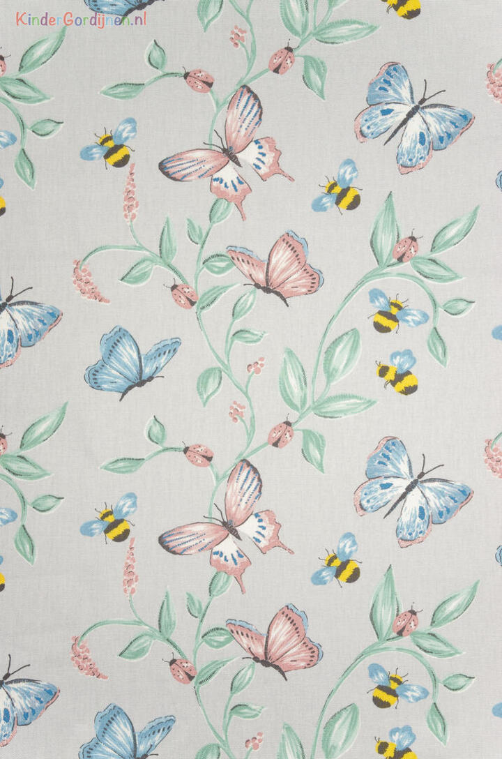 De vlinders en bijen fladderen en zoemen over de mooie iets wat matte katoenen gordijnstof.
