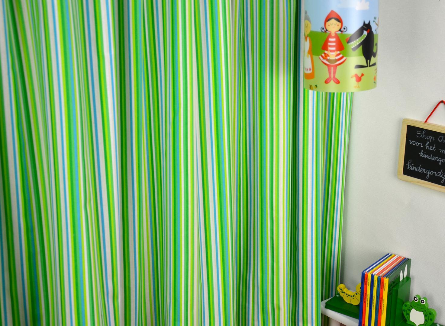 Katoenen gordijn met smalle strepen in de lengterichting. De gevarieerde gordijnstof met drie kleurtinten is beschikbaar in mosgroen, felblauw of frisgroen.