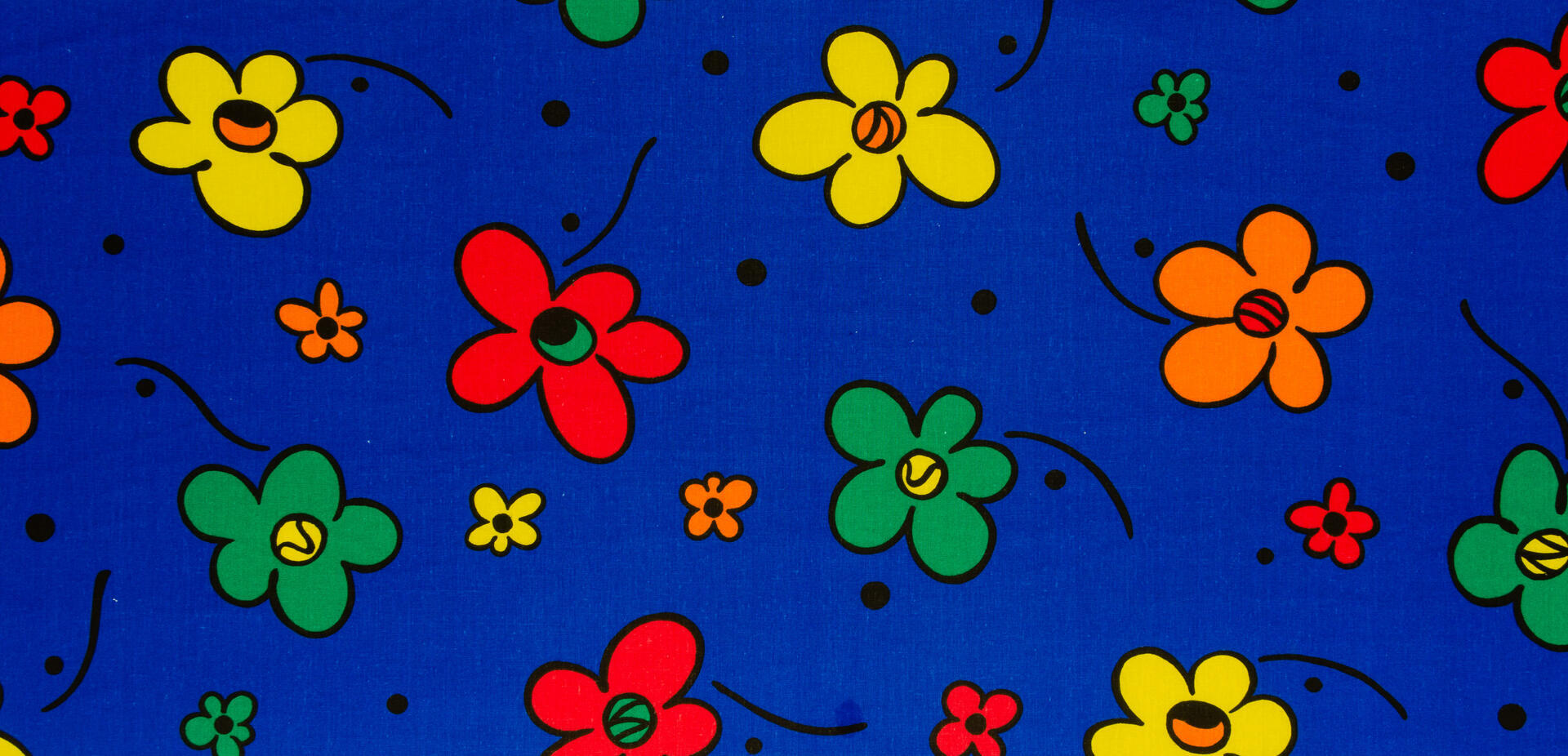 Deze bijzonder populaire gordijnstof heeft grote vrolijke gekleurde bloemen op een donkerblauwe achtergrond.