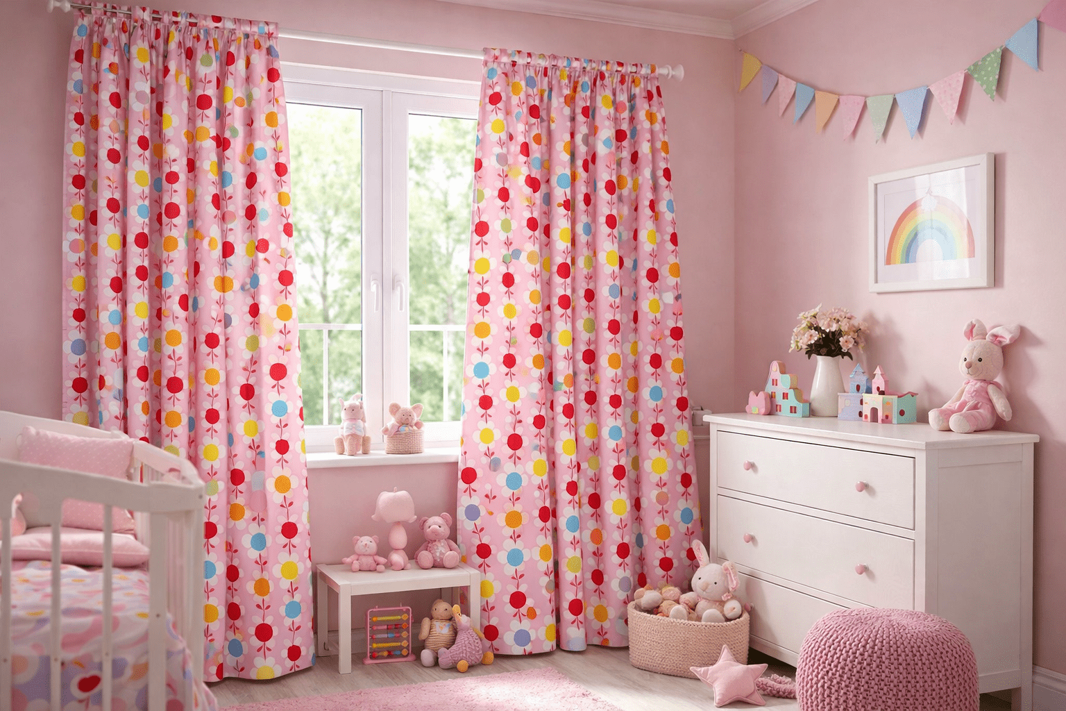 Bloemengordijn voor de baby-meisjeskamer – zacht, vrolijk en tijdloos