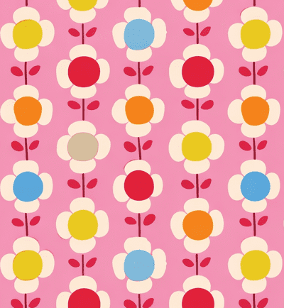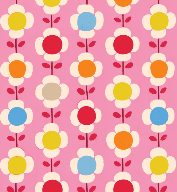 Dit gordijn laat een speels en vriendelijk bloemenpatroon zien dat perfect past in een baby- of meisjeskamer. Het motief bestaat uit herhalende bloemen die in strakke verticale banen zijn geplaatst. Elke bloem heeft een ronde kern en zachte bloemblaadjes, waardoor het geheel een rustige en overzichtelijke uitstraling krijgt. Tussen de bloemen lopen fijne steeltjes met kleine blaadjes, wat het dessin een lieflijk en herkenbaar karakter geeft.