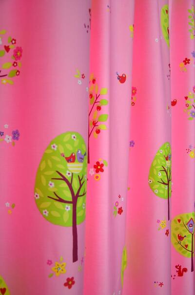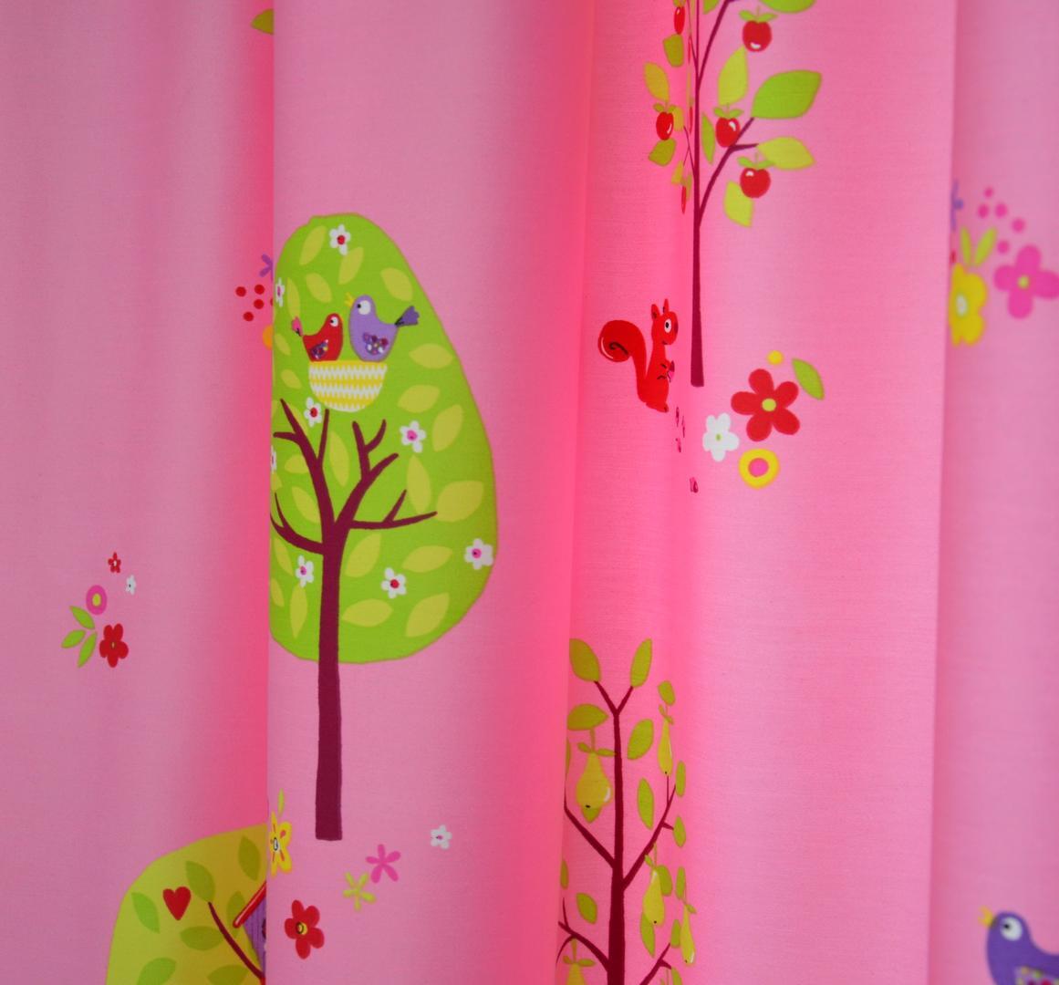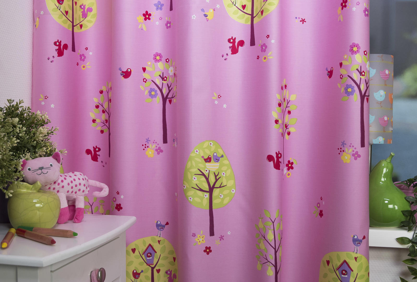 Snoezig meidengordijn vol bomen die omringd worden door schattige eekhoorntjes, vogeltjes en hun huisjes. Dit unieke kindergordijn is uitgevoerd in een lila kleur en past daardoor perfect in een echte meisjeskamer!
