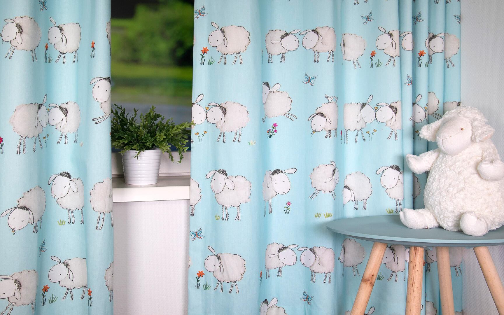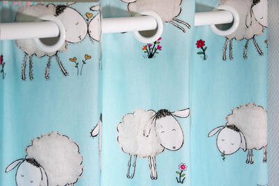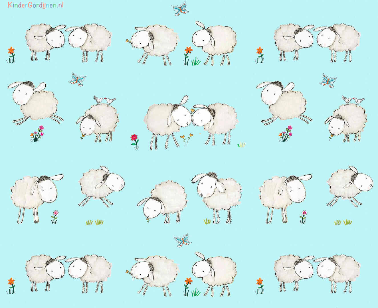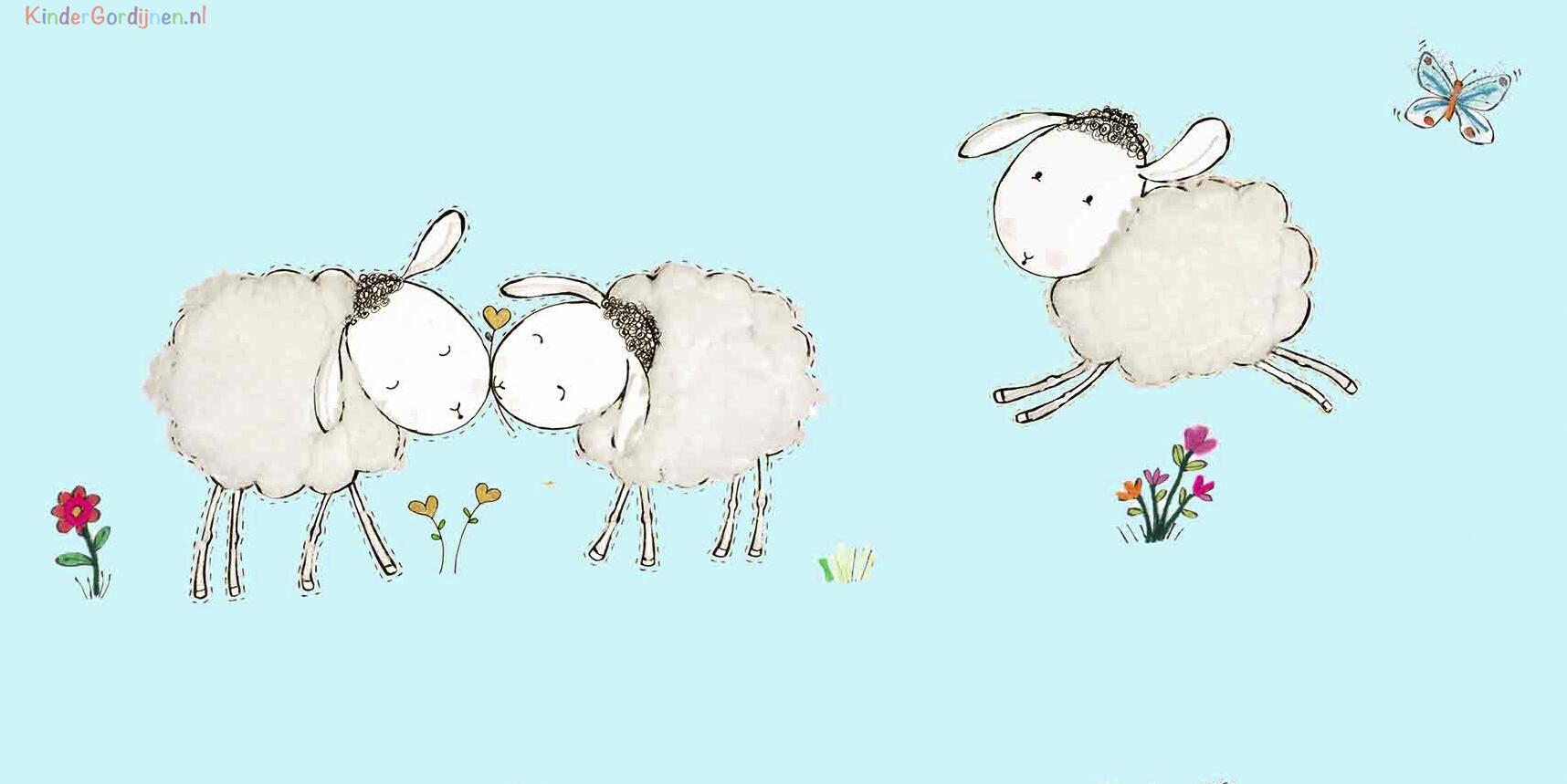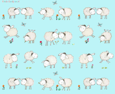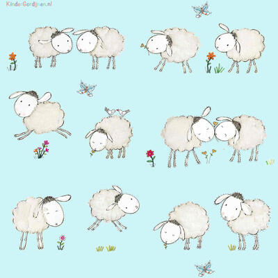 Een súper schattig schaapjesgordijn voor de kinderkamer, ontworpen door Hanneke de Jager. Deze beeldend kunstenares is schrijver en tevens illustrator van een aantal bijzonder leuke kinderboeken. Zij omschrijft haar stijl als: fris, kleurrijk, levendig, speels en zonnig. Door gebruik van verschillende materialen zoals stofjes van de markt, knopen en gebreide truien, geeft zij haar illustraties iets unieks. In het patroon zie je namelijk de weergave van die leuke details van de verschillende texturen. Zo heeft het schaapje een bijna aaibare wollen vacht.