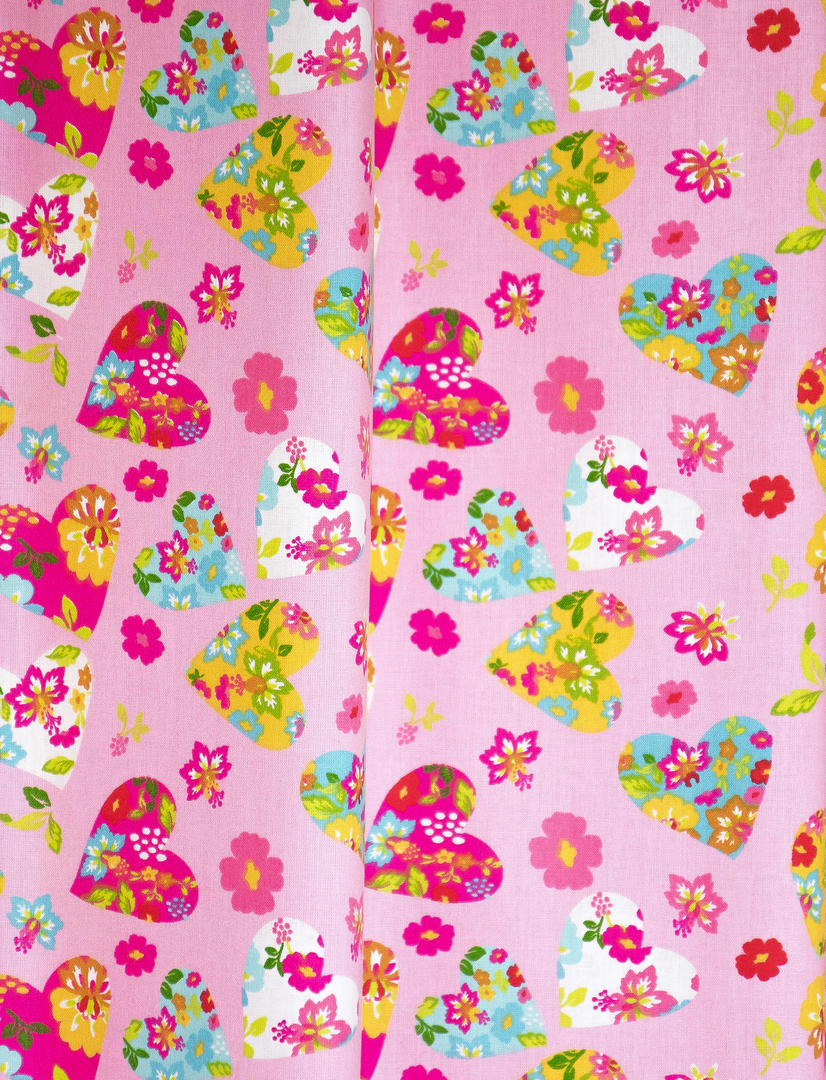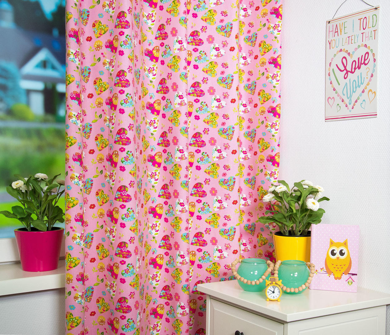 SNOEZIG gordijn voor de meisjeskamer! Heerlijke hartjes & bloemen zijn gedrukt op een zachtroze ondergrond, waardoor het gordijn een PIP-achtige uitstraling krijgt. Ken je dat? Pittige tinten en patronen tegen een rustige wand. Met zo’n vrolijk kleurenpalet maak je echt een statement! De stof is glad geweven, mat en lichtdoorlatend, voor verduistering en mooier kleurbehoud is voeren een goede optie. PINK is a girls best friend!!