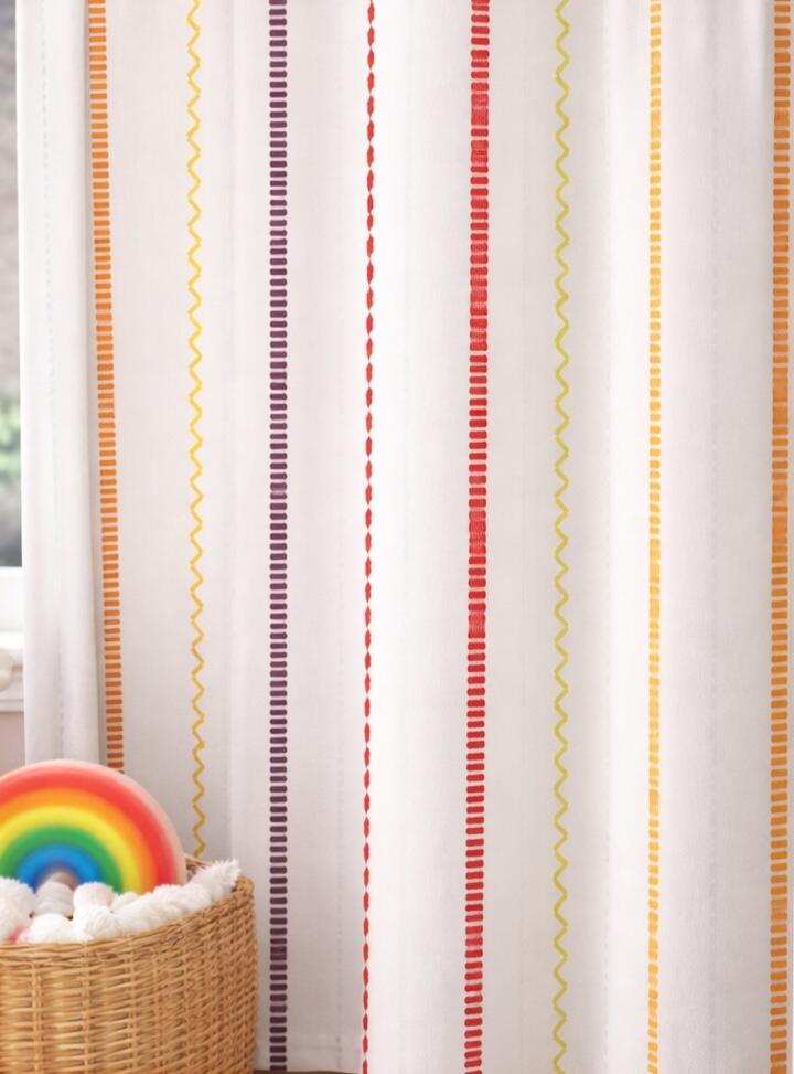 De lichte basis van de stof laat het daglicht zacht door en zorgt ervoor dat de kleuren helder blijven. In een kinderkamer of speelse ruimte geeft deze variant een opgewekt karakter, terwijl het strakke lijnenspel ervoor zorgt dat het patroon netjes blijft.