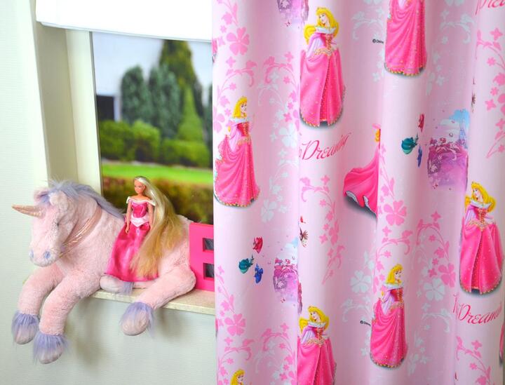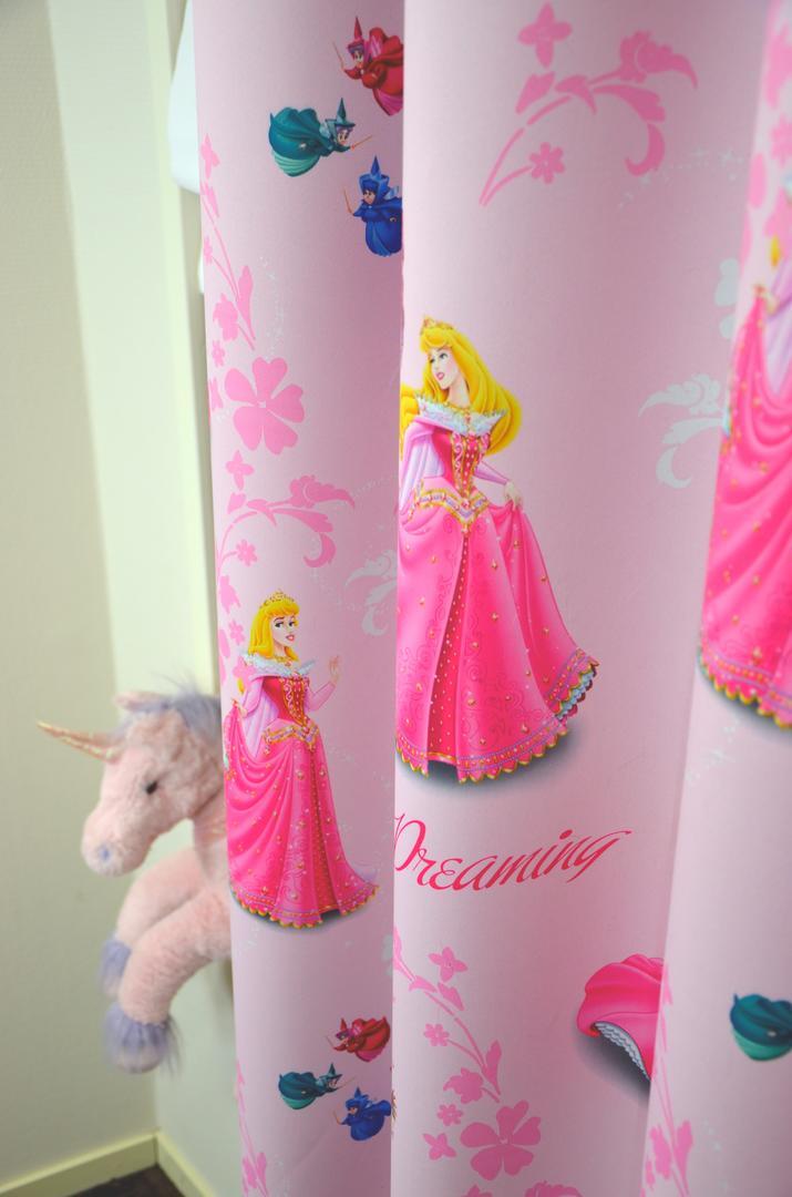 Heerlijk wegdoezelen naar dromenland terwijl deze lieve prinsessen een oogje in het zeil houden. De gordijnstof is samengesteld uit polyester en volledig verduisterend.