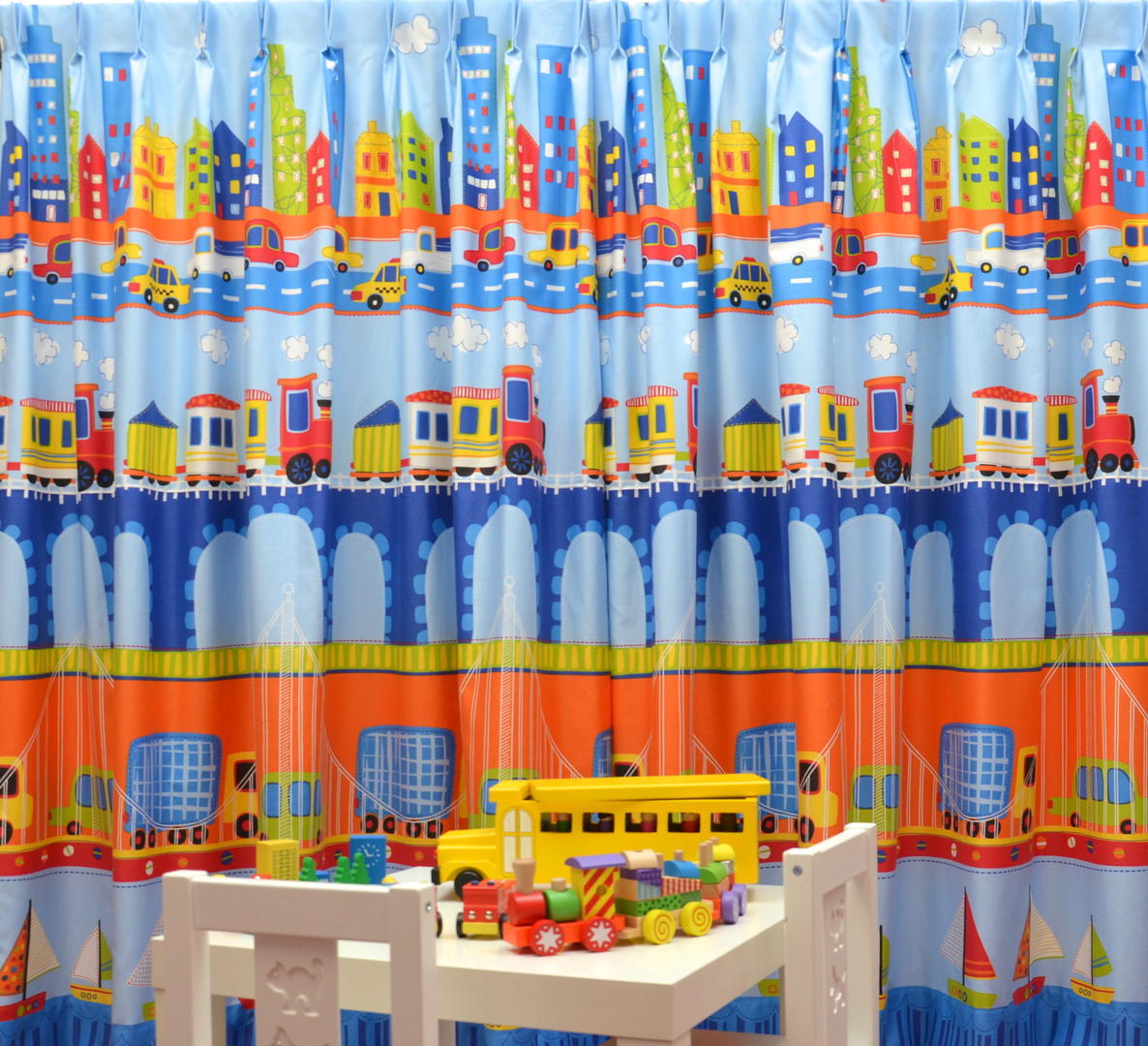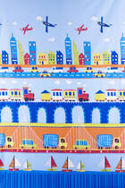 Auto, trein en boot, al reizend word je blij & groot. Héérlijk gordijn voor ondernemende kids! Ook voor ouders is dit een fijn gordijn, want doordat dit kamerhoge stof is, heb je geen naden in de stof. Voor het zelfde geld kan dit fraai tot de grond worden geconfectioneerd. Optisch geeft dat een ruimtelijk effect omdat de kamer hoger lijkt. De stof is satijnglad geweven en aan de voorzijde bedrukt met verschillende vrolijke prints. Op de zachtblauwe, matte ondergrond komen de frisse kleuren heel mooi uit. Zoek jij voor een groot raam een geschikt patroon? Dan is dit gordijn de perfecte oplossing! Let’s travel together.