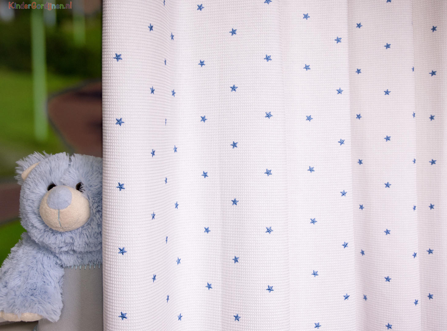 SCHATTIG! Een gordijn voor de babykamer dat rustig is en toch extra decoratief. Dat komt door de wafelpiqué structuur. Dit is een heel fijn ingeweven ribje, wat de stof optisch meer warmte geeft. In combinatie met een harde vloer (laminaat/ Novilon) geeft het daardoor een extra aantrekkelijke ‘boost’. De voor- en achterzijde hebben dezelfde kleur. Het geweven sterretje is 1 cm groot. Dit fraaie babykamer gordijn combineert vast & zeker uitstekend met jouw hemeltje/ aankleedkussen en lakentjes.