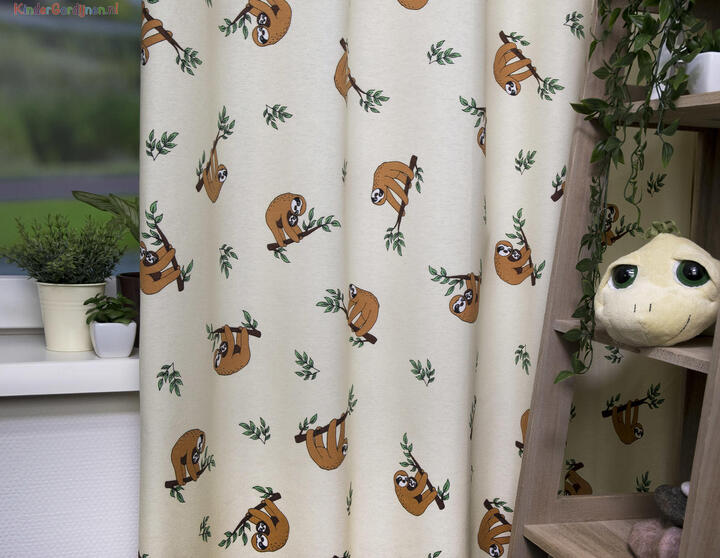 Oh kijk nou wat lief! Deze lieve luiaard zijn zo moe dat je automatisch wil slapen. Maar ze zijn ook heel erg lief en schattig. Over het hele gordijn liggen ze heerlijk op of aan een tak. Soms met een baby en anders alleen. Het materiaal dat gebruikt is voor dit kindergordijn is 100% Hierdoor is het een zacht kindergordijn wat lekker soepel valt. Door de lichte achtergrond komen de luiaards nog beter tot hun recht. Je kan zelf kiezen of je hem laat verduisteren of niet maar als je het doet dan ben je gelijk klaar met dit kindergordijn. Je hoeft geen rolgordijn meer te kopen hiervoor. Gordijnen dicht en het is donker.