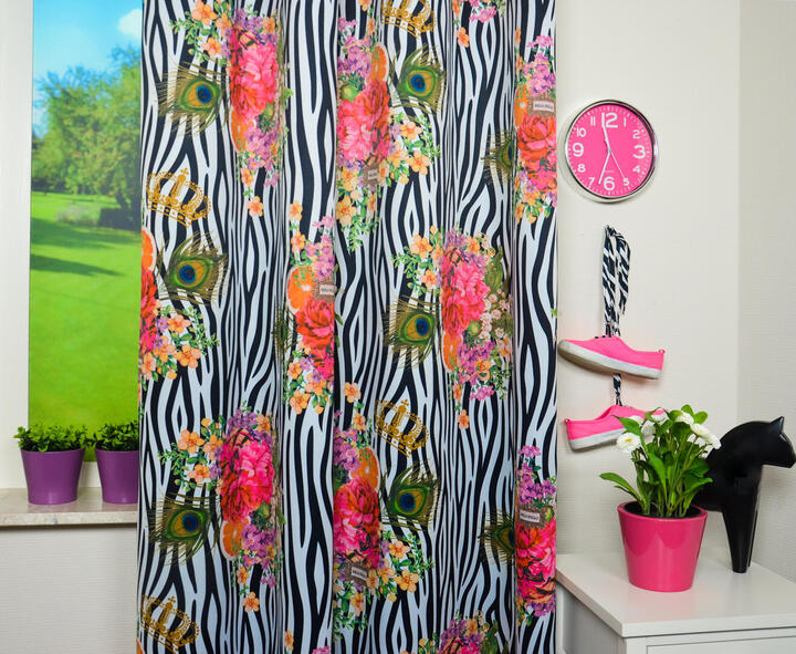 Té gek, zebraprint gordijnen van het hippe merk MELLI MELLO! Zebra is hot en daardoor super leuk te combineren met …. nog méér ZEBRA! Kussens, dekbedovertrek, zwart-wit behang of misschien juist een knal-kleur? Met dit gordijn creëer jij een super eigentijdse & blitse kamer. De stof is direct dim-out, waardoor jouw kamer prettig donker wordt.. De achterzijde is gebroken wit en daardoor aardig warmtewerend. De ‘bloemenbunch’ is 25 cm in doorsnede. Zie je het al voor je in jouw kamer?