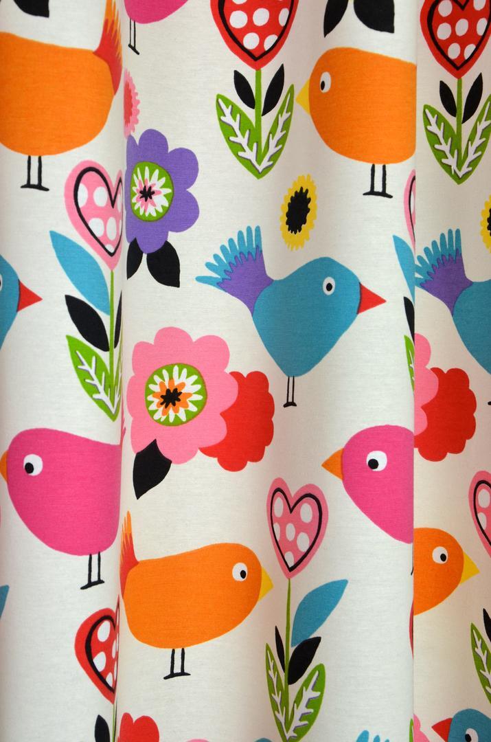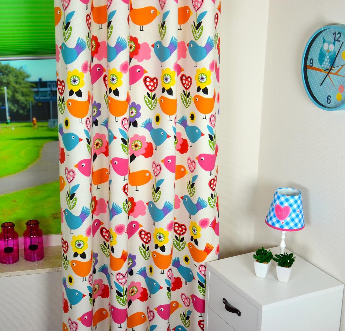 “Tweet tweet” begin de dag met een lach, lijken deze vogeltjes te zeggen. Een super vrolijk gordijn, met vrolijke kleuren op een frisse, matte ondergrond. De ‘tweeties’ zijn 10 x 15 cm en gedrukt op heel licht geribde stof. Deze vogeltjesstof is uitstekend te combineren met bloemen behang of een uitgesproken accentkleur op de muur. Ga jij dan voor romantisch roze of mystiek lilla-paars? Er kan van alles, jij mag kiezen! Voor verduistering even laten voeren.