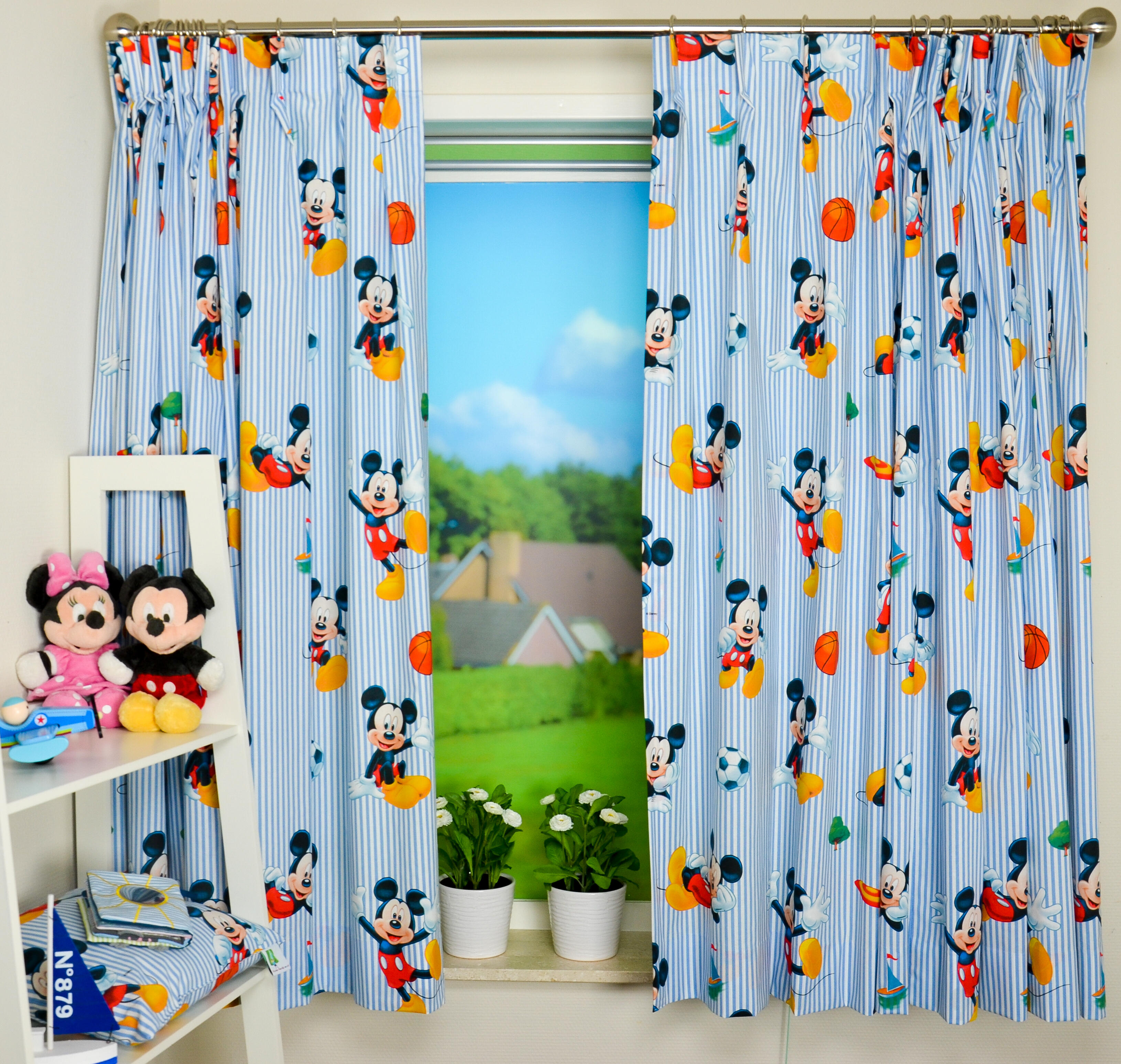 Katoenen kindergordijn van Mickey Mouse met prachtige blauwe tinten.