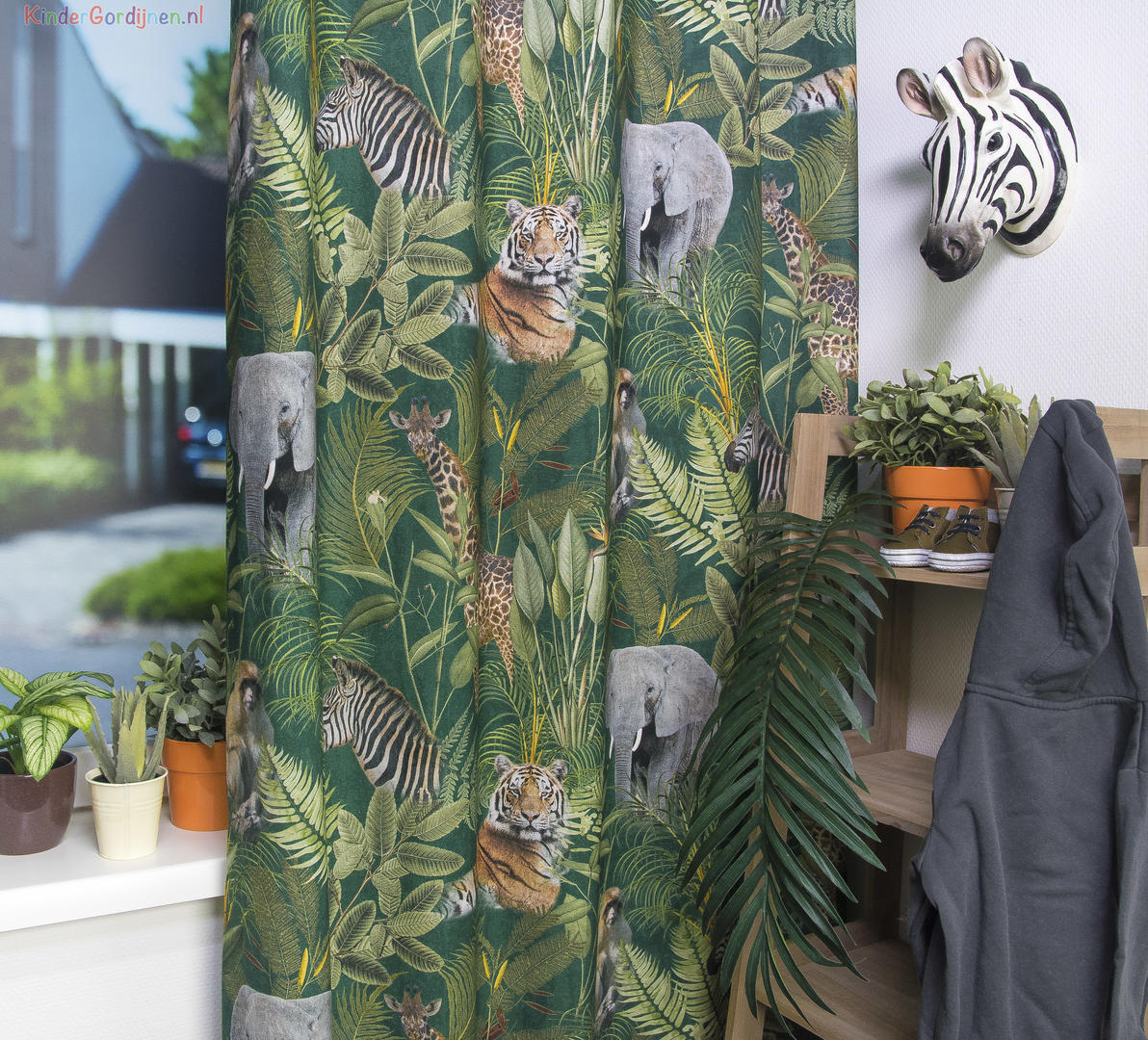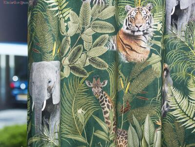 De Moremi is een speels en levendig gordijn dat de kamer vult met de avontuurlijke sfeer van de Afrikaanse savanne. De diepgroene achtergrond vormt het decor voor een prachtig tafereel van wilde dieren die tussen weelderige bladeren en tropische planten tot leven lijken te komen. Op de stof zijn onder andere zebra’s, giraffen, olifanten, tijgers, leeuwen en nieuwsgierige aapjes te zien, allemaal zorgvuldig afgebeeld tussen botanische vormen in verschillende tinten groen, zachtgeel en bruin. De stof voelt soepel aan en valt mooi in de plooi, ideaal voor een kinderkamer waarin gezelligheid en fantasie centraal staan. Dankzij de rijke kleurencombinatie en het gedetailleerde dessin is dit gordijn niet alleen praktisch, maar ook een echte blikvanger aan het raam. De Moremi-gordijnstof is ruim op voorraad, waardoor een snelle en zorgvuldige levering mogelijk is. Tijdens het bestelproces kan worden gekozen voor een voering.