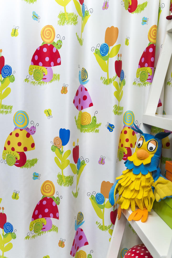 De kinderkamer verandert in een spannend sprookjesbos met deze prachtigelgekleurde slakken en paddenstoelen De kindergordijnen zijn geschikt voor de jongenskamer en de meisjeskamer. De lichte gordijnstof kunnen wij voor u voeren en verwerken tot een volledig gordijn.