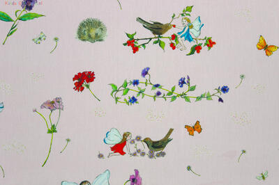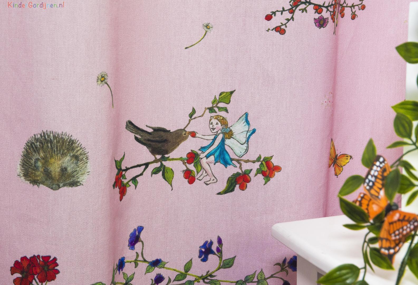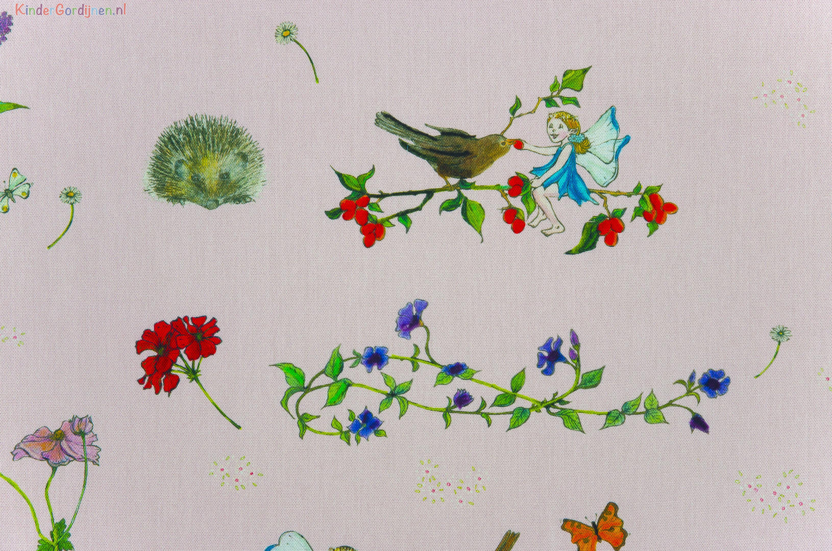 Een súper schattig meisjesgordijn voor de kinderkamer, ontworpen door Hanneke de Jager. Deze beeldend kunstenares is schrijver en tevens illustrator van een aantal bijzonder leuke kinderboeken. Zij omschrijft haar stijl als: fris, kleurrijk, levendig, speels en zonnig. Door gebruik van verschillende materialen zoals stofjes van de markt, knopen en gebreide truien, geeft zij haar illustraties iets unieks. In het patroon zie je namelijk de weergave van die leuke details van de verschillende texturen. Zo zit het vlindermeisje op een haast levensechte roos omringt door allemaal lieve dierenvrienden.
