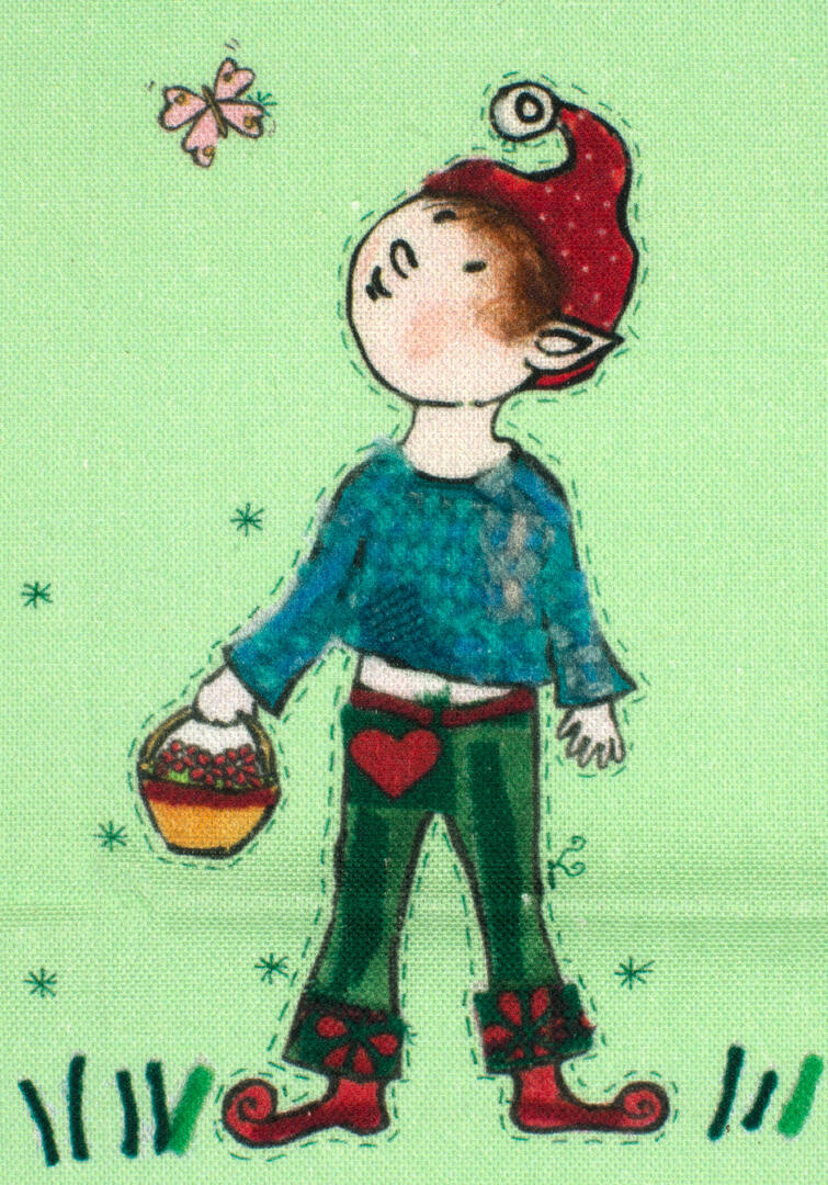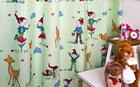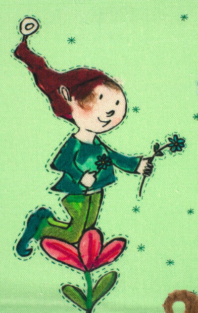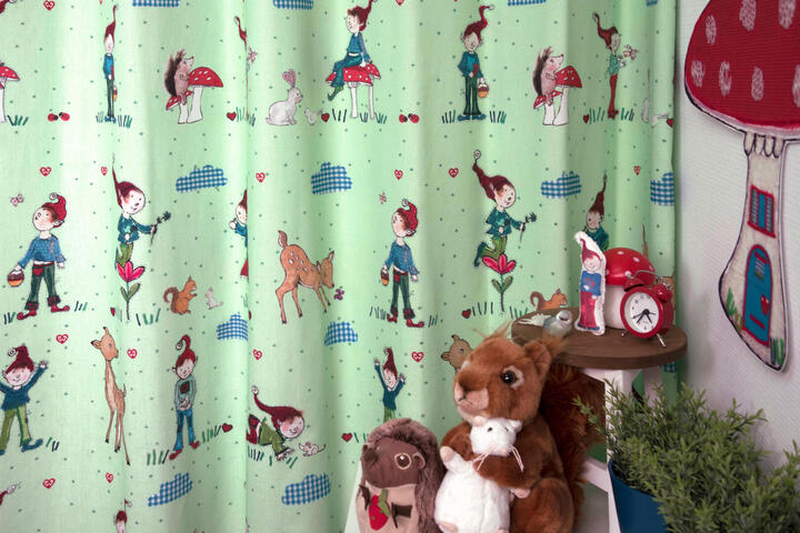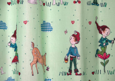Een sprookjesachtig kaboutergordijn voor de kinderkamer, ontworpen door Hanneke de Jager. Deze beeldend kunstenares is schrijver en tevens illustrator van een aantal bijzonder leuke kinderboeken. Zij omschrijft haar stijl als: fris, kleurrijk, levendig, speels en zonnig. Door gebruik van verschillende materialen zoals stofjes van de markt, knopen en gebreide truien, geeft zij haar illustraties iets unieks. In het patroon zie je namelijk de weergave van die leuke details van de verschillende texturen. Zo heeft het kabouter jongetje haast tastbare kleertjes aan, zo écht lijkt het.