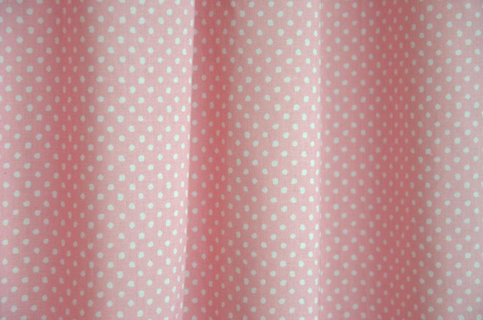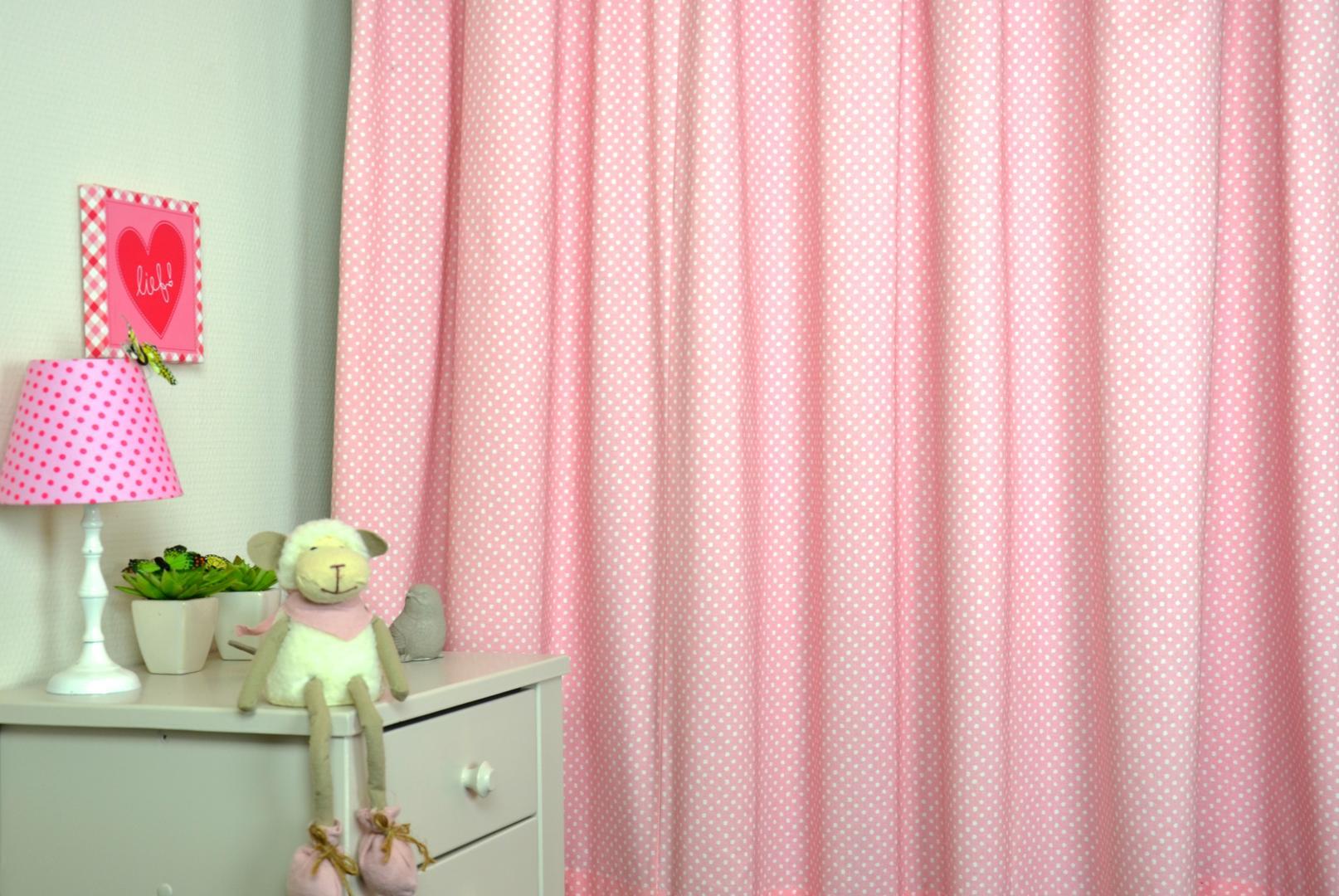 Populair kindergordijn met een eenvoudig stippenmotief tegen een roze of blauwe achtergrond. De stip heeft een doorsnede van 5mm. De katoenen gordijnstof voelt heerlijk zacht aan en kan door KinderGordijnen.nl gevoerd worden tot verduisterend gordijn.